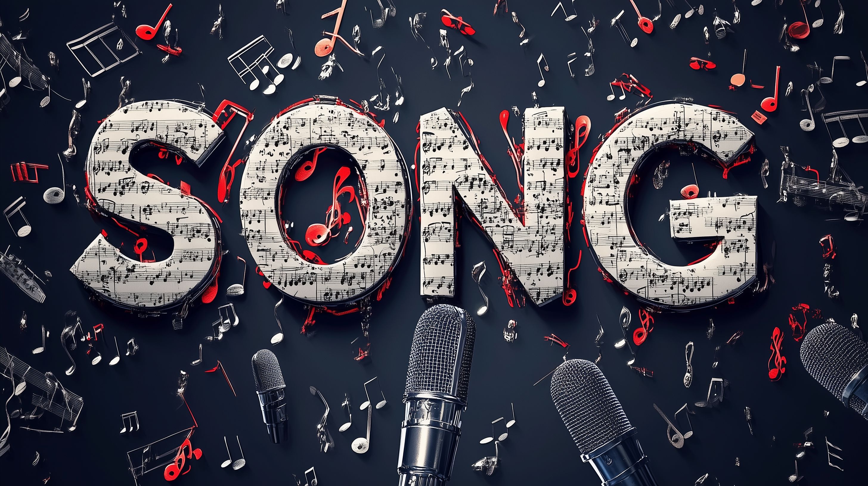 Dieses Stockfoto zeigt ein kreatives musikalisches Arrangement. Im Vordergrund sind große stilisierte Notenblatter zu sehen, die mit roten Akzenten hinterlegt sind. Dahinter sind mehrere Mikrofone zu erkennen, die die musikalische Darbietung unterstreichen. Das Ganze ist vor einem dunklen Hintergrund inszeniert, der den Fokus auf die Hauptelemente lenkt und eine dramatische Stimmung erzeugt.