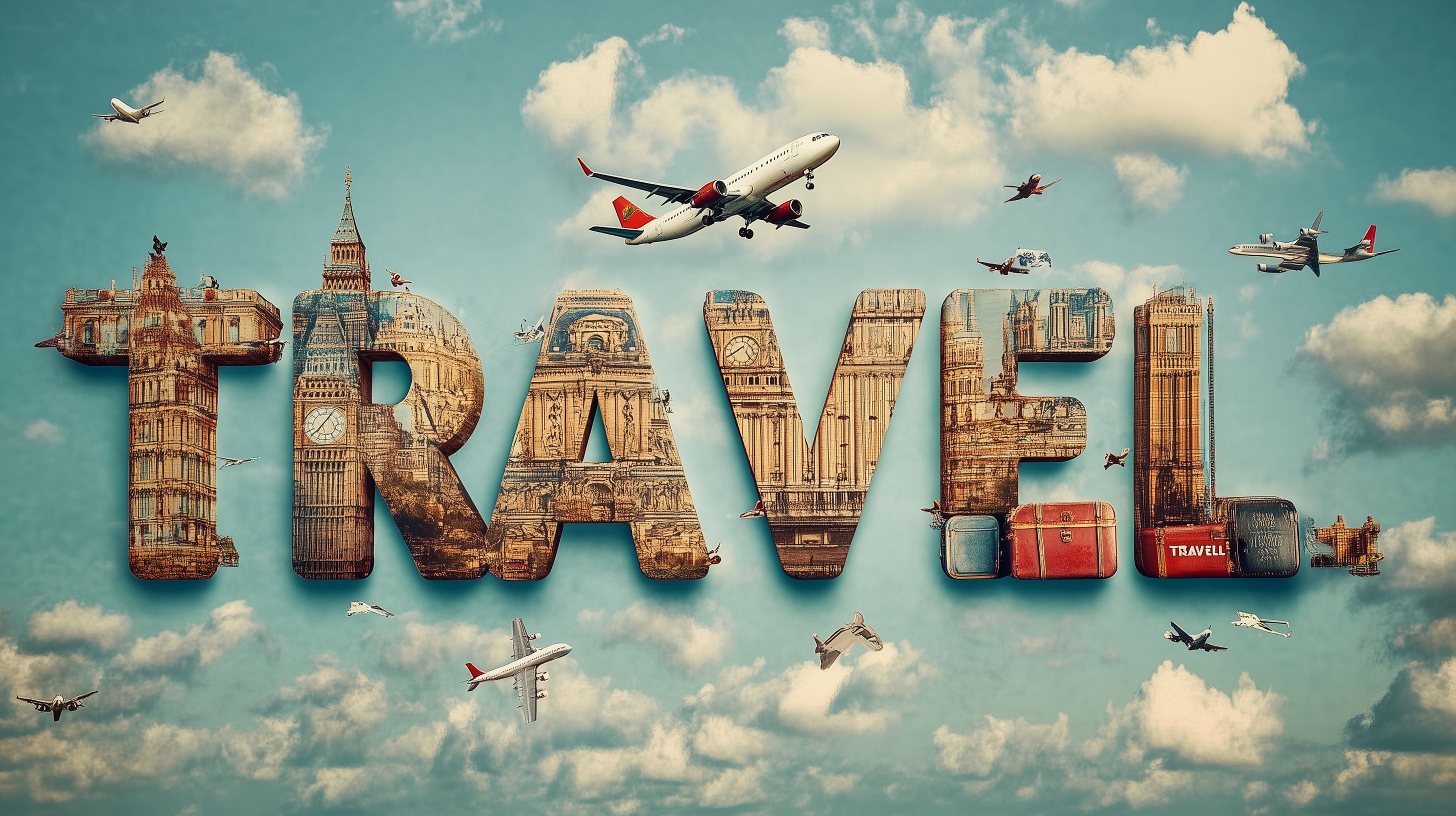 Dieses kreativ gestaltete Foto-Konzept ist eine faszinierende visuelle Komposition, die das Thema Reisen und Tourismus auf einzigartige Weise inszeniert. Es zeigt verschiedene historische Bauwerke wie den Big Ben und den Buckingham-Palast in London, die in die Wortform 'TRAVEL' integriert sind. Gleichzeitig fliegen Flugzeuge durch den Himmel und verleihen der Szene eine dynamische Bewegung.