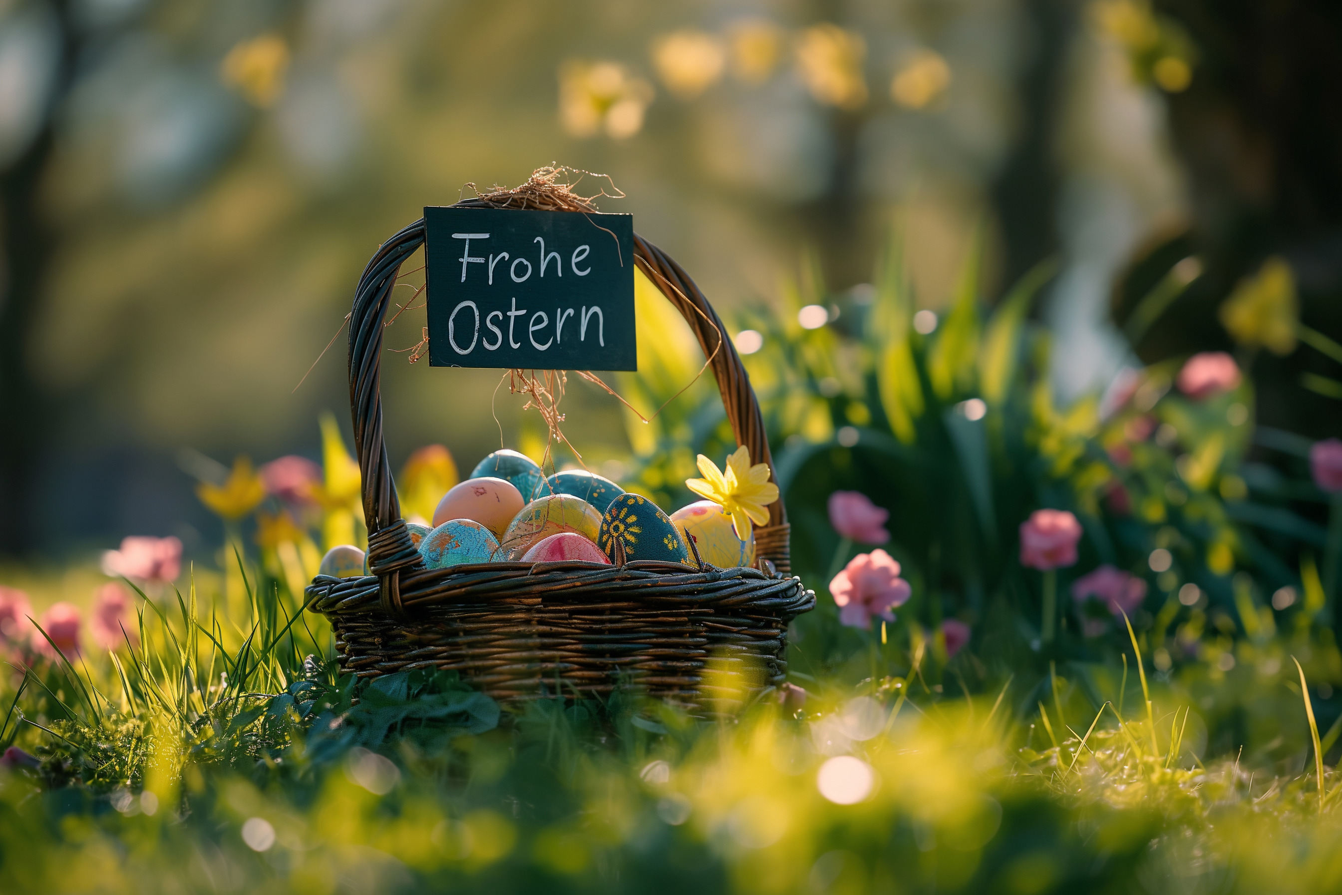 Dieses Foto zeigt einen Osterkorb gefüllt mit bunten Eiern und Frühlingsblumen auf einer grünen Wiese. Die Nahaufnahme aus der Draufsicht-Perspektive betont die dekorative Anordnung der Objekte in einer goldenen Beleuchtung. Die pastellfarbene Farbpalette und die weiche Unschärfe des Hintergrunds schaffen eine stimmungsvolle und natürliche Komposition.
