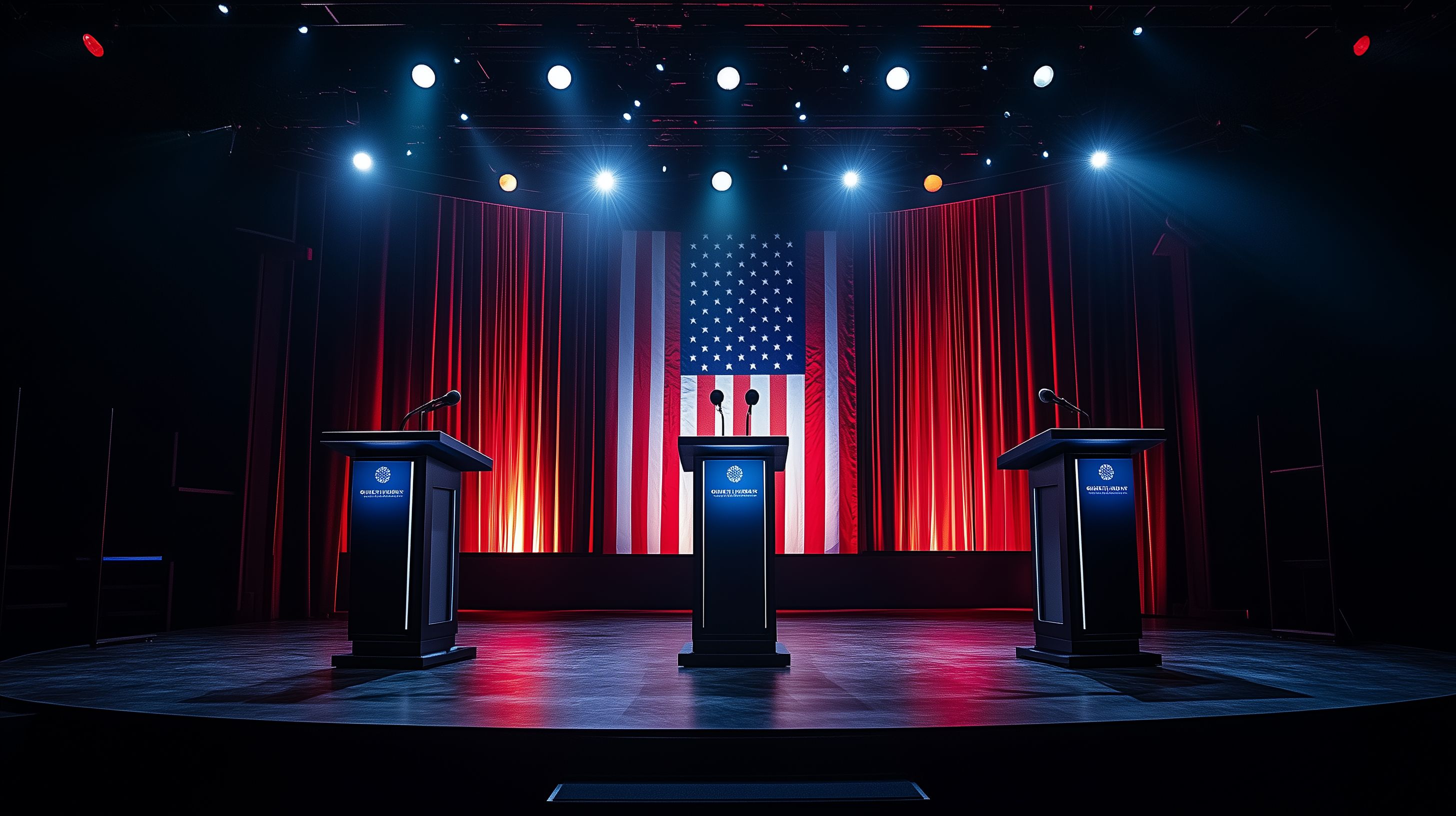 Das Bild zeigt eine feierlich geschmückte Bühne mit drei Rednerpulten, vor denen eine US-Flagge als Hintergrund prangt. Die Bühne ist in dunkles Blau und Rot getaucht, was eine festliche Atmosphäre schafft. Die drei Rednerpulte sind ebenfalls in diesen Farben gehalten und mit Scheinwerfern beleuchtet, die das Geschehen in Szene setzen.