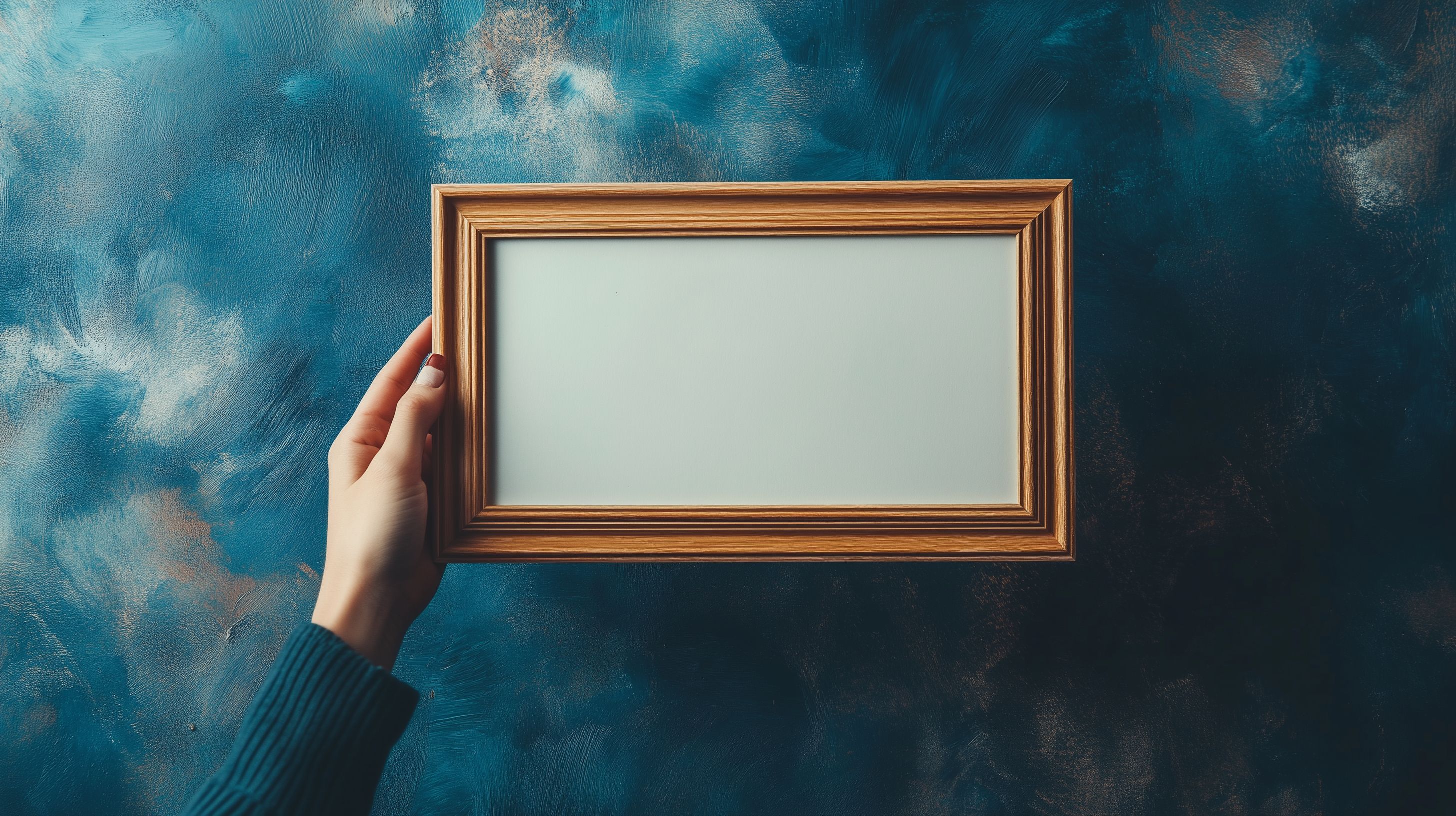 Dieses Bild zeigt einen goldenen Bilderrahmen, der von einer Hand vor einem abstrakten Hintergrund in Blau- und Grüntönen gehalten wird. Der Rahmen ist leer, sodass der Fokus ganz auf der farbenfrohen, malerischen Umgebung liegt. Diese Komposition strahlt eine Stimmung von Ruhe, Kreativität und Offenheit aus. Das Foto eignet sich hervorragend als Gestaltungselement für Blogs, Newsletter, Werbeanzeigen oder Beiträge in sozialen Medien. Es ist ein hochwertiges, kostenloses Stockfoto, das unter der Creative-Commons-Lizenz zur freien Nutzung bereitsteht.