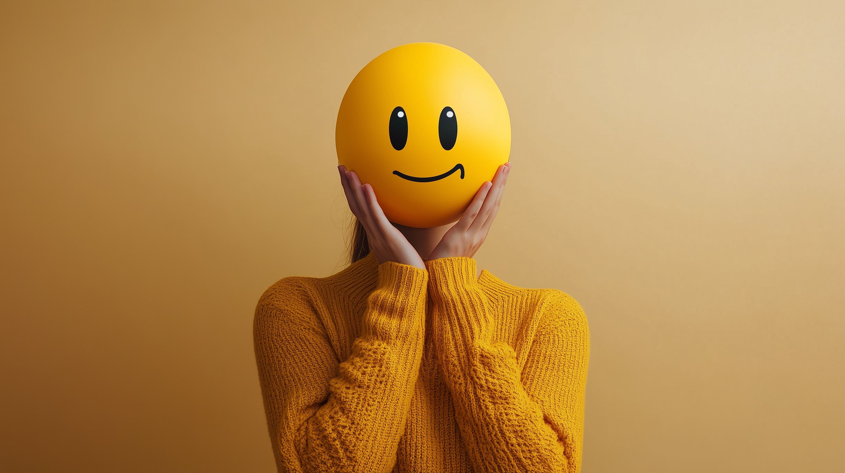Das Bild zeigt eine Person, die einen gelben, lächelnden Smiley-Ballon vor ihr Gesicht hält, während sie einen gelben Wollpullover trägt. Der Kontrast zwischen dem strahlenden Gelb des Pullovers und des Ballons erzeugt eine fröhliche, positive Stimmung. Das minimalistische, konzeptionelle Foto eignet sich hervorragend als Stockfoto für verschiedene Zwecke wie Blogbeiträge, Newsletter-Grafiken, Social-Media-Posts oder Werbematerialien. Das hochauflösende Bild steht unter einer Creative-Commons-Lizenz kostenfrei zum Download zur Verfügung.