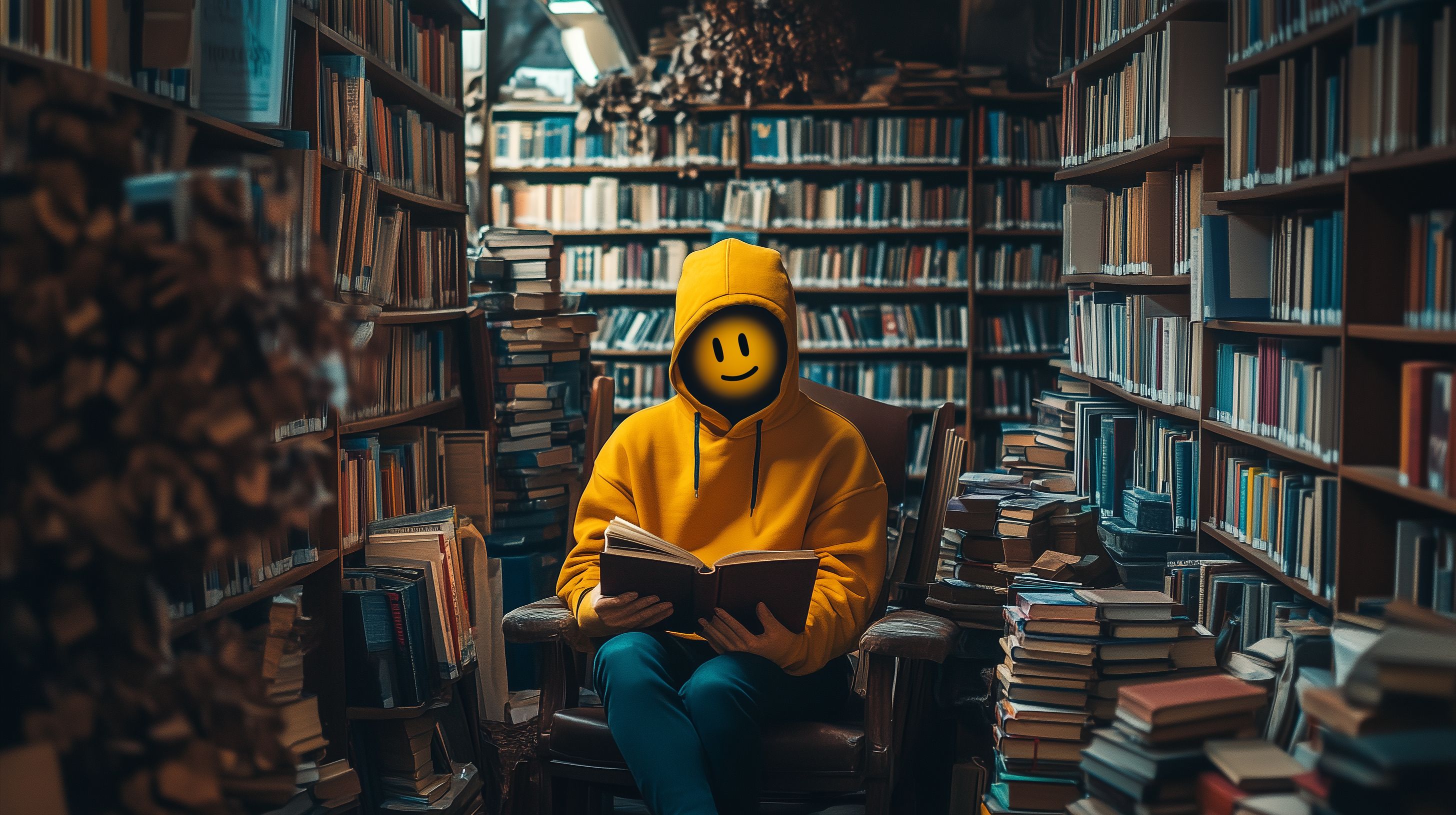 Das Foto zeigt eine Person, deren Gesicht von einer Smiley-Maske verdeckt ist, in einer mystischen Bibliotheksumgebung. Der Leser sitzt in einem Sessel zwischen hoch aufragenden Bücherregalen, umgeben von Stapeln von Büchern und in einen orangefarbenen Hoodie gehüllt. Die düstere, warme Beleuchtung und die leicht verwischten Konturen verleihen dem Bild eine geheimnisvolle Atmosphäre. Das Bild eignet sich hervorragend für den Einsatz in Blogbeiträgen, Newslettern oder auf Social-Media-Kanälen, die sich mit den Themen Lesen, Wissen, Kreativität oder Anonymität befassen. Als kostenloses Stockfoto in hoher Auflösung und unter der Creative-Commons-Lizenz kann es vielfältig verwendet werden.