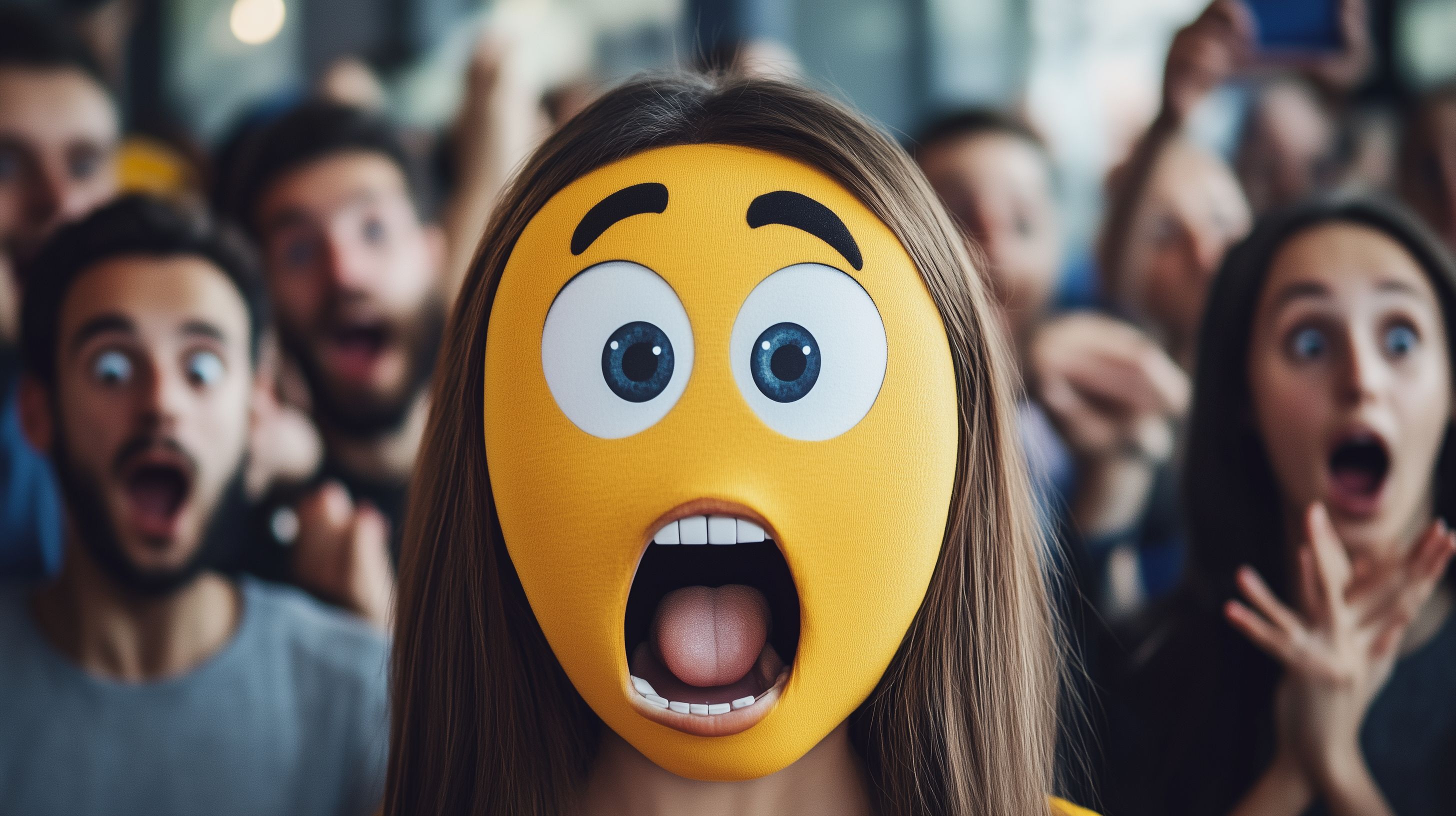 Das Bild zeigt einen überraschten, schockierten Gesichtsausdruck inmitten einer Menschenmenge. Ein großes, gelbes Emoticon-Gesicht mit weit aufgerissenen Augen und offenem Mund dominiert die Szene, während im Hintergrund weitere Personen mit teils ähnlichen Gesichtsausdrücken zu sehen sind. Das Bild vermittelt eine Stimmung von Erstaunen, Verwunderung und Reaktion auf unerwartete Ereignisse. Es eignet sich hervorragend als Illustrationselement für Blogbeiträge, Social-Media-Posts, Werbekampagnen und andere Projekte, die eine humorvolle, emotionale Note erfordern. Dieses hochauflösende Stockfoto steht unter der Creative-Commons-Lizenz kostenlos zur Verwendung zur Verfügung.