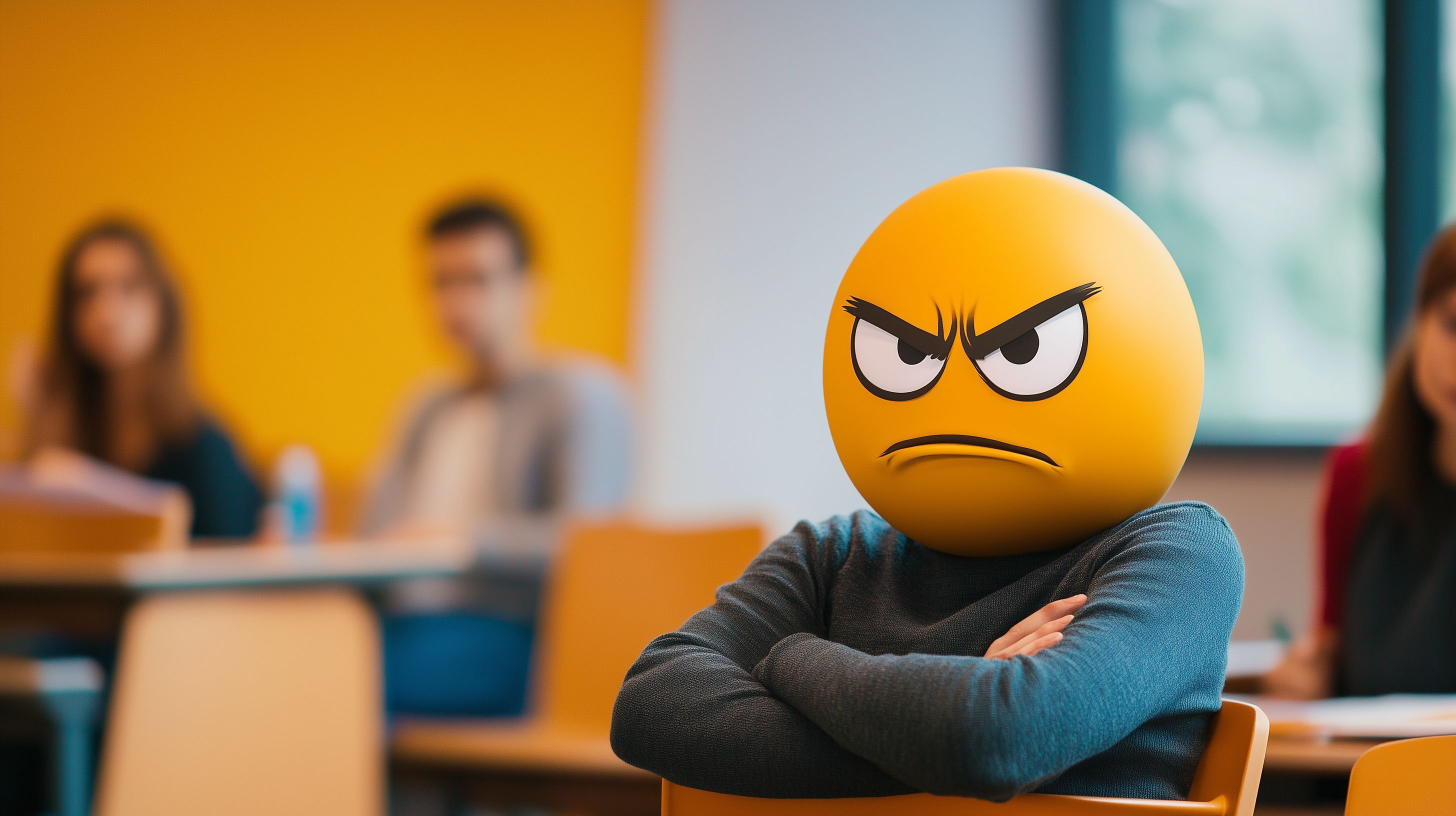 Das Foto zeigt einen genervten, frustrierten Gesichtsausdruck, dargestellt durch einen emotionalen Emoji-Ballon im Vordergrund. Im Hintergrund sind verschwommen einige Personen zu sehen, die offenbar einen Klassenraum oder eine ähnliche Lernumgebung darstellen. Die auffallende gelb-orangene Farbgebung verleiht der Szene eine intensive, gereizte Stimmung.