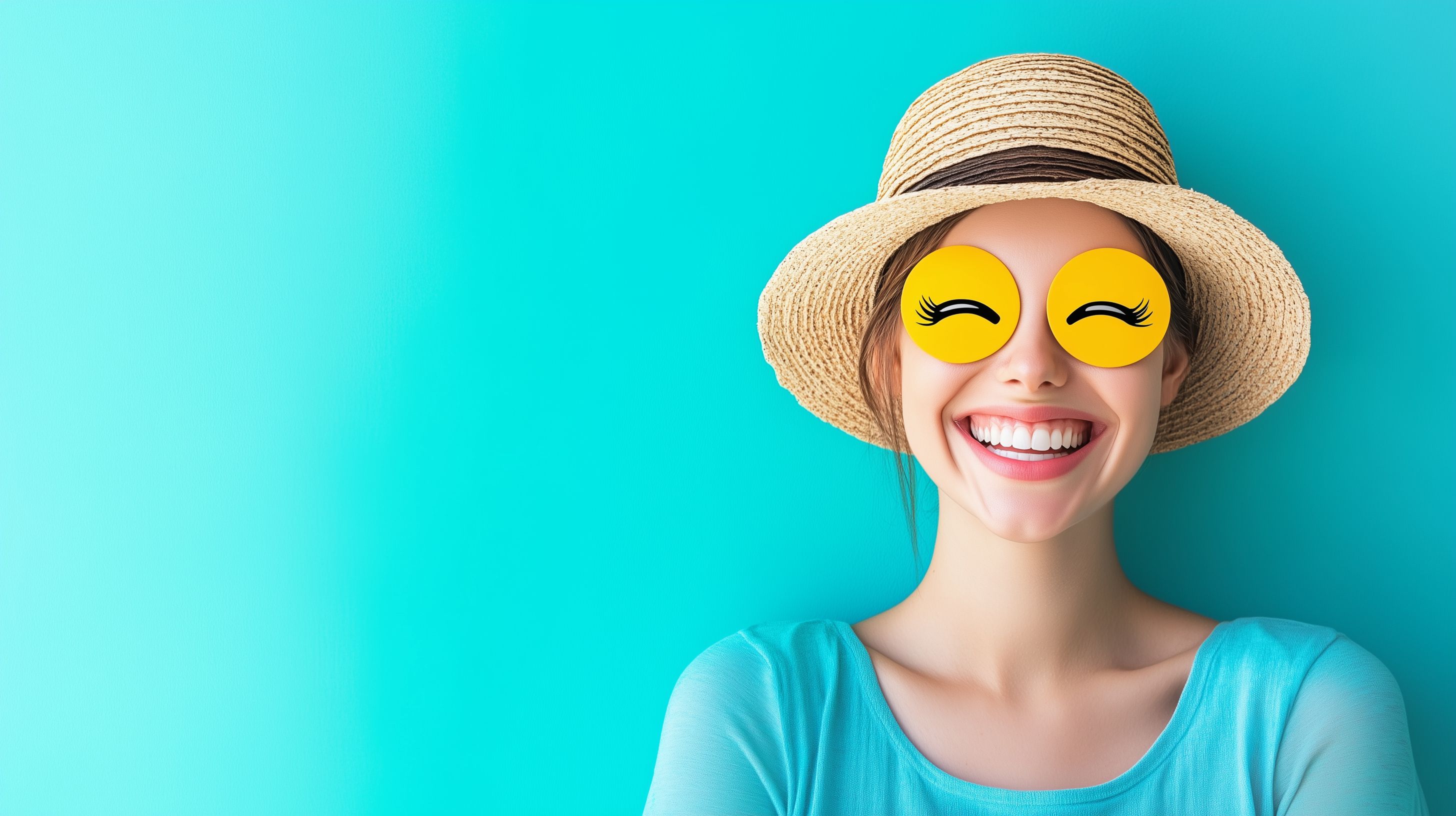 Das Bild zeigt eine lächelnde Frau mit Strohhut, die ein Emoticons-Sonnenbrillenpaar trägt. Sie hat einen fröhlichen, entspannten Ausdruck und strahlt eine sommerliche, urlaubsreife Stimmung aus. Das Foto ist in kräftigem Türkis gehalten, was den Gesamteindruck von Leichtigkeit und Lockerheit verstärkt. Dieses einladende Foto eignet sich hervorragend für den Einsatz in Blogs, sozialen Medien, Newslettern oder Werbematerialien, um eine freudige, trendige Atmosphäre zu vermitteln. Als hochauflösendes Stockfoto unter Creative-Commons-Lizenz ist es kostenfrei nutzbar.