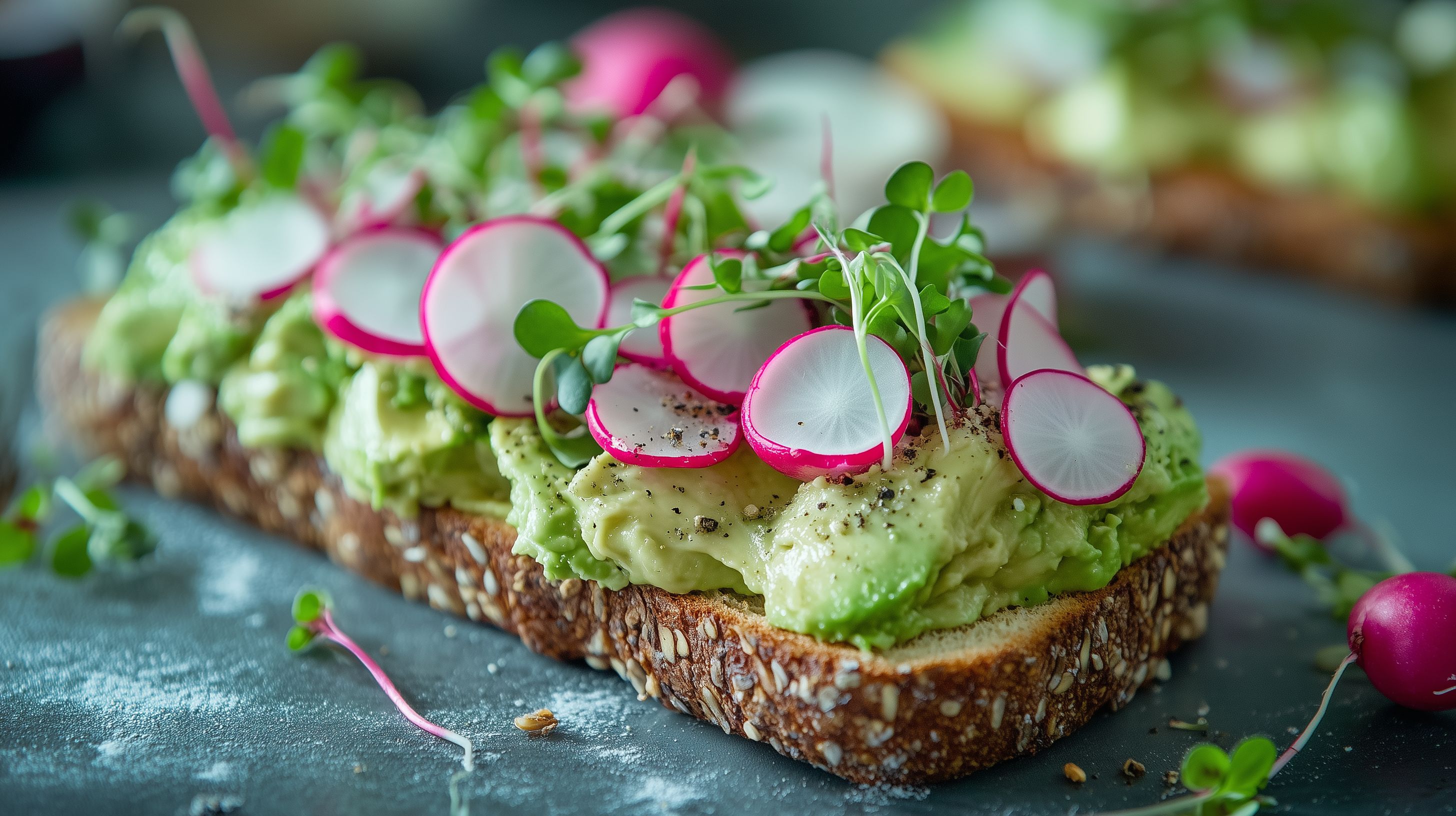 Das Bild zeigt ein appetitliches Avocado-Toast, dekorativ mit grünen Kräutern und knackigen roten Radieschen angerichtet. Die rustikale Optik mit der rauen Brotoberfläche und der natürlichen Farbwelt aus Grün- und Rottönen verleiht dem Foto eine frische und gesunde Ausstrahlung. Dieses Stockfoto eignet sich ideal für die Verwendung in Blogs, Newslettern, auf Social-Media-Kanälen oder in Werbematerialien rund um das Thema gesunde Ernährung, Frühstück oder Snacks. Das hochauflösende Bild steht unter einer Creative-Commons-Lizenz kostenlos zur Verfügung.