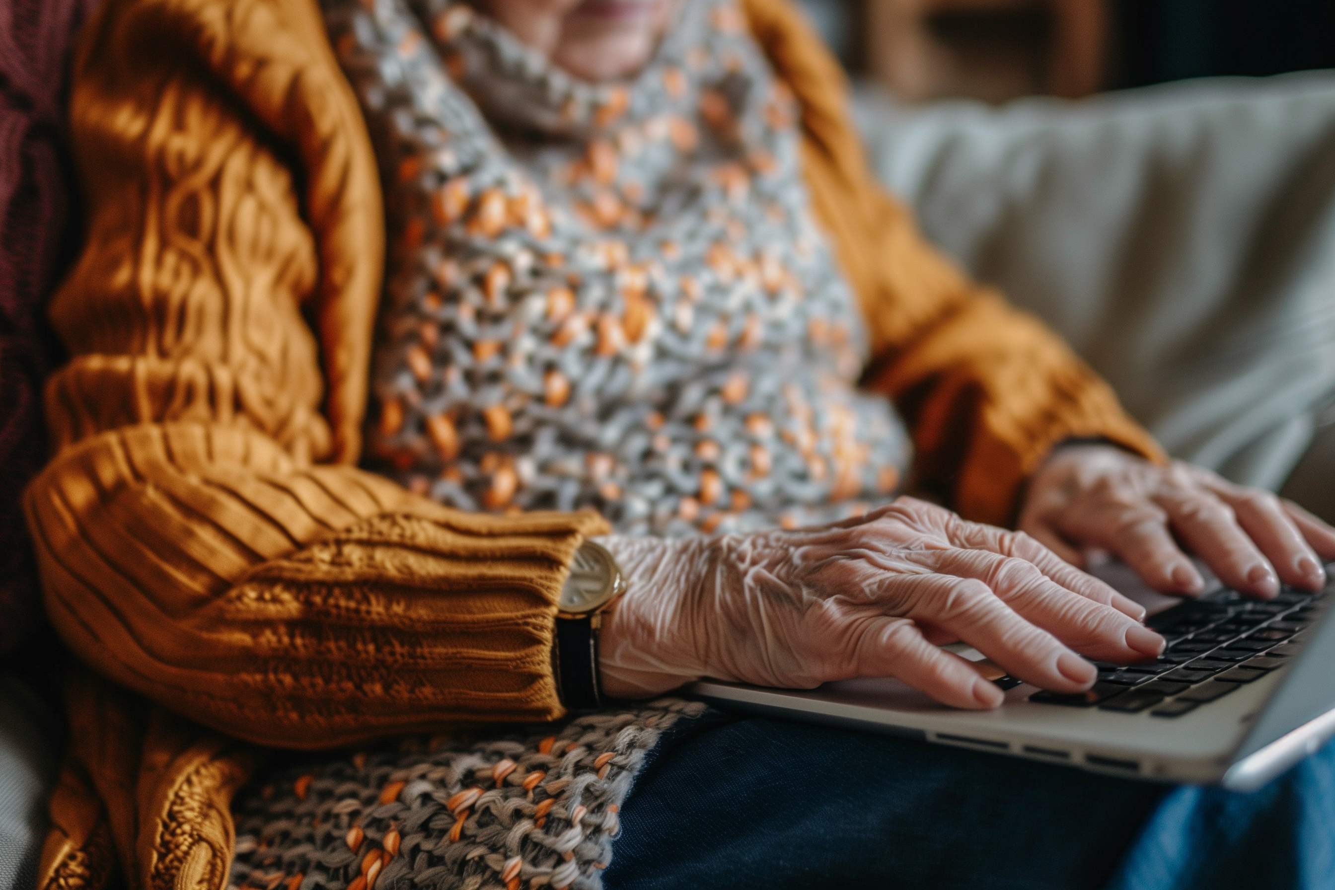 Das Bild zeigt eine ältere Frau, die konzentriert an ihrem Laptop arbeitet. Sie trägt einen bunten, gemusterten Pullover und sitzt in einem gemütlichen Sessel. Die Aufnahme hat eine warme, natürliche Farbgebung und vermittelt einen ruhigen, entspannten Eindruck. Dieses Stockfoto eignet sich ideal für Blogbeiträge, Newsletter-Gestaltung oder Social-Media-Posts zu Themen wie digitale Transformation, Seniorenarbeit oder Work-Life-Balance. Es ist in hoher Auflösung und unter einer Creative-Commons-Lizenz verfügbar, sodass es kostenfrei und flexibel eingesetzt werden kann.
