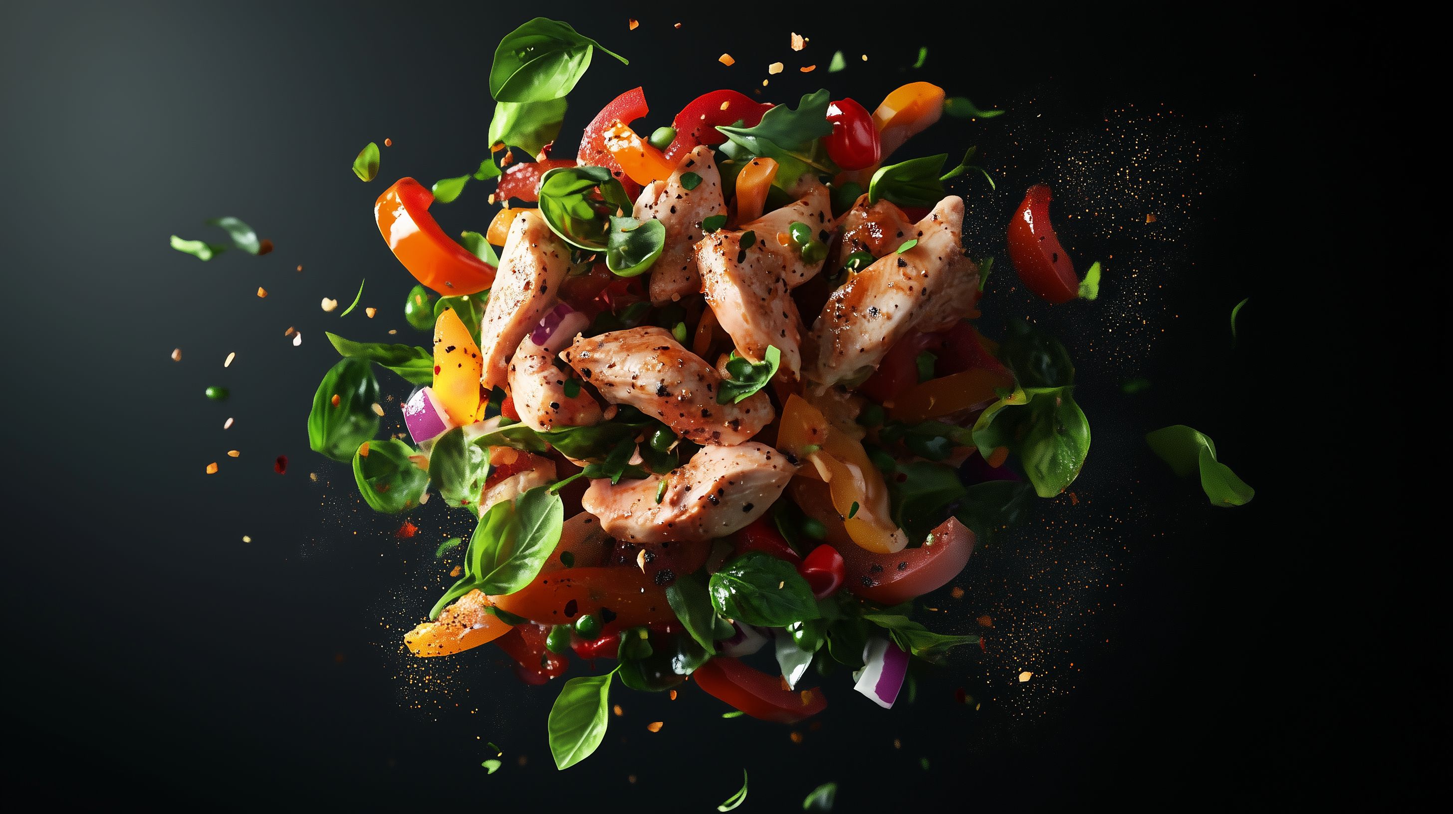Dieses köstliche Foto zeigt einen appetitlichen Grillhähnchen-Salat, der mit frischem Gemüse wie bunten Paprikastücken, Tomatenvierteln und grünen Basilikumblättern angereichert ist. Die Zutaten sind in einer rustikalen Schüssel angeordnet, was dem Gericht eine natürliche, authentische Optik verleiht. Das Hähnchenfleisch ist offensichtlich gegrillt, was ihm eine leicht rauchige Note und knusprige Oberfläche verleiht. Insgesamt wirkt das Gericht sehr frisch, nährstoffreich und lecker. Dieses Foto eignet sich hervorragend als kostenloses Stockfoto für Blogs, Social-Media-Postings oder Werbematerial rund um gesunde, leichte Sommerküche in hoher Auflösung und unter einer Creative-Commons-Lizenz.