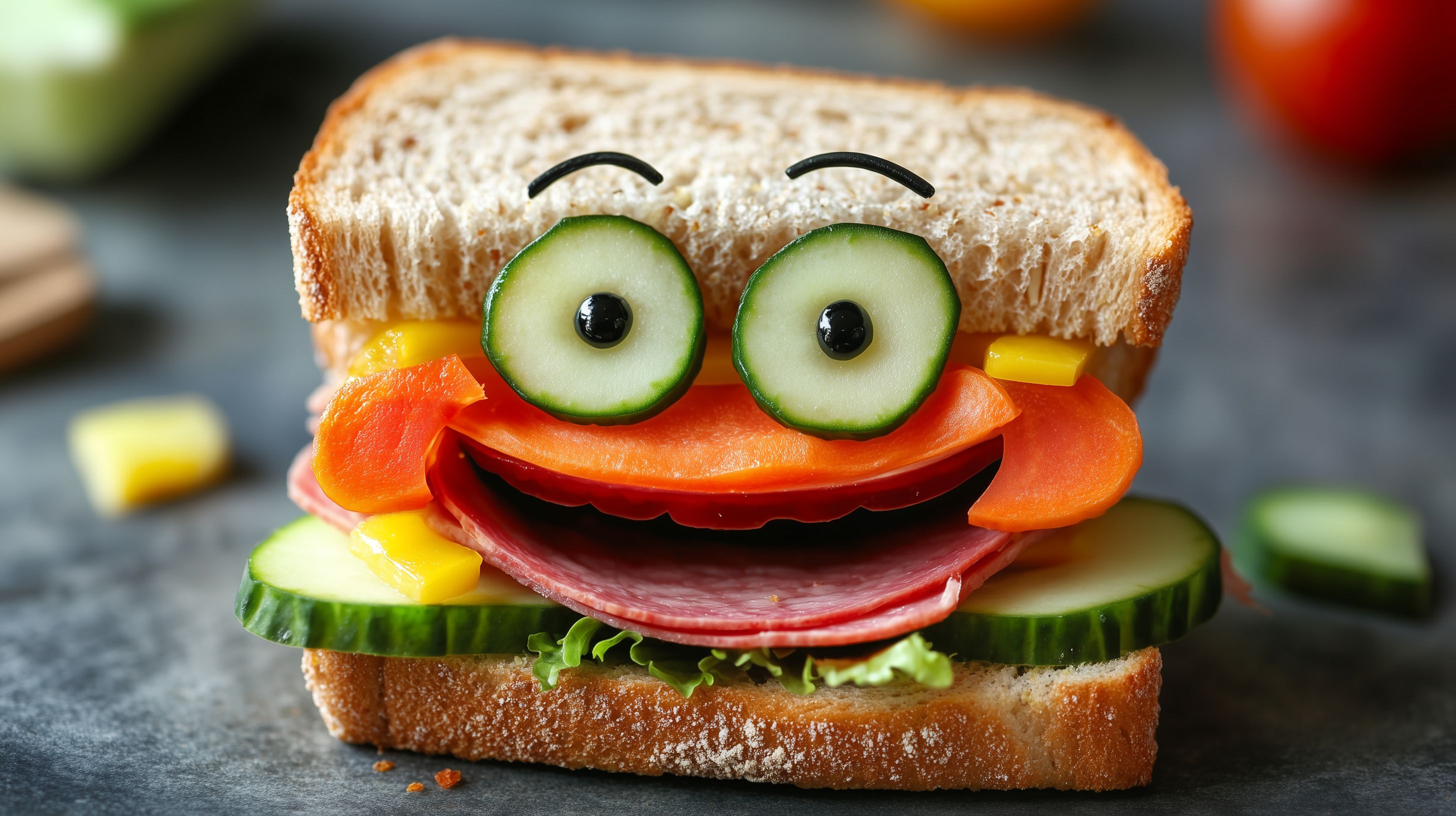 Dieses Foto zeigt ein kreatives und fröhliches Sandwich, das in Form eines Gesichts mit Augen, Nase und Mund gestaltet wurde. Das Brot ist mit verschiedenen Gemüsesorten wie Gurke, Paprika und Tomaten belegt, die das Gesicht bilden. Durch die farbige und fantasievolle Präsentation wird ein appetitliches und einzigartiges Lebensmittelbild geschaffen, das sich perfekt für Kinder und jung gebliebene Erwachsene eignet. Das Foto eignet sich hervorragend für die Verwendung in Blogs, Newslettern, sozialen Medien oder Werbekampagnen rund um gesunde Ernährung, kreative Küche oder Familienthemen. Das hochauflösende Stockfoto ist kostenfrei unter Creative-Commons-Lizenz nutzbar.