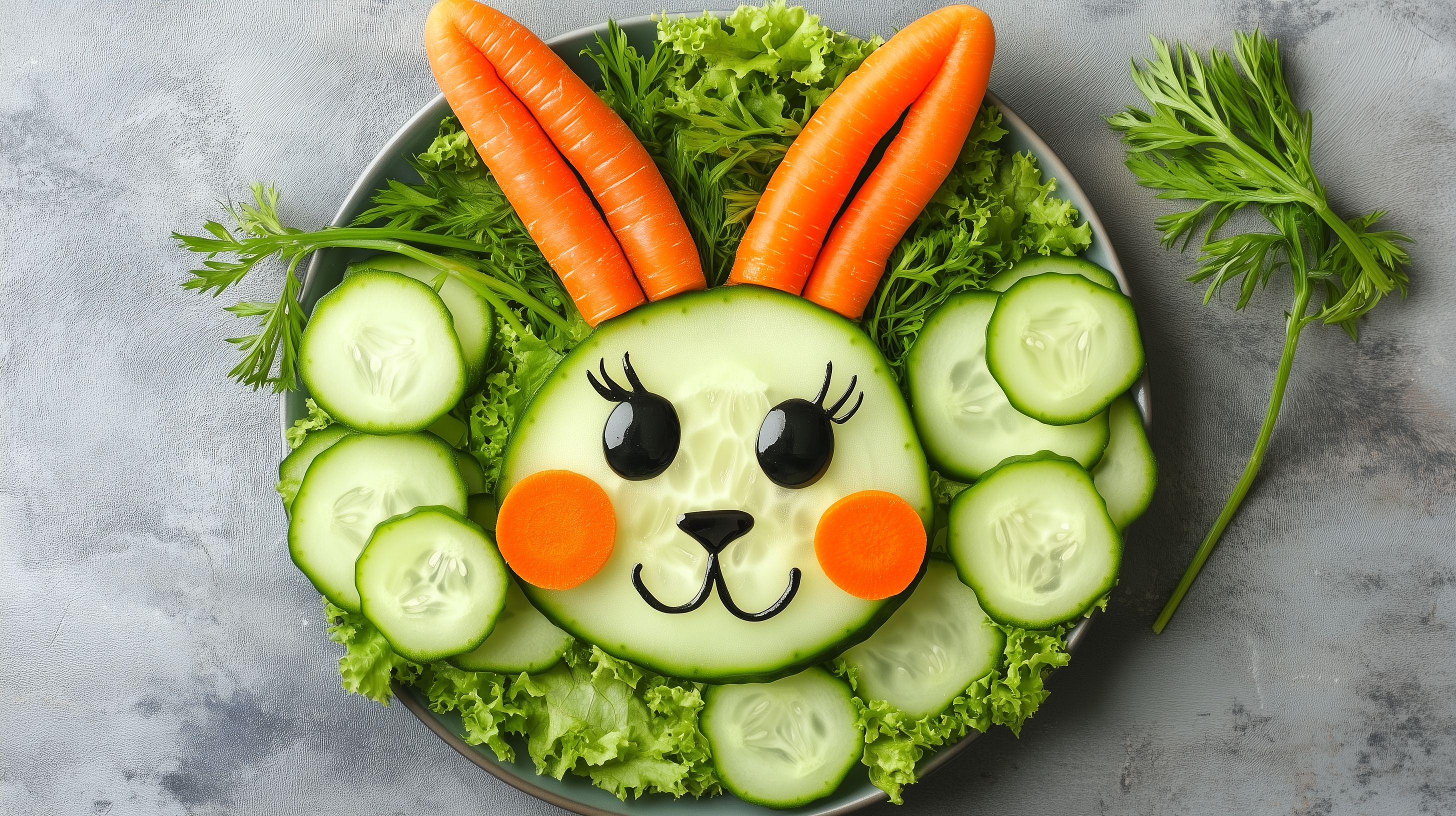 Das Bild zeigt ein kreativ arrangiertes Gemüsearrangement in Form eines Hasengesichts. Auf einem dunklen Teller liegen frisches, buntes Gemüse wie Karotten, Gurken und Salat. Die Augen und das Näschen des Hasen sind aus Gurkenscheiben und Möckchen geformt, die das Gesicht des niedlichen Gemüsehasen bilden. Die natürlichen Farben und die liebevolle Gestaltung verleihen dem Foto einen frischen, appetitlichen und zugleich verspielten Charakter. Dieses Stockfoto eignet sich ideal für den Einsatz in Lebensmittelblogs, Kochrezepten, Ernährungsratgebern oder auch für visuelle Inhalte in den sozialen Medien. Mit seiner hohen Auflösung und Creative-Commons-Lizenz steht es Ihnen für vielfältige Zwecke zur Verfügung.