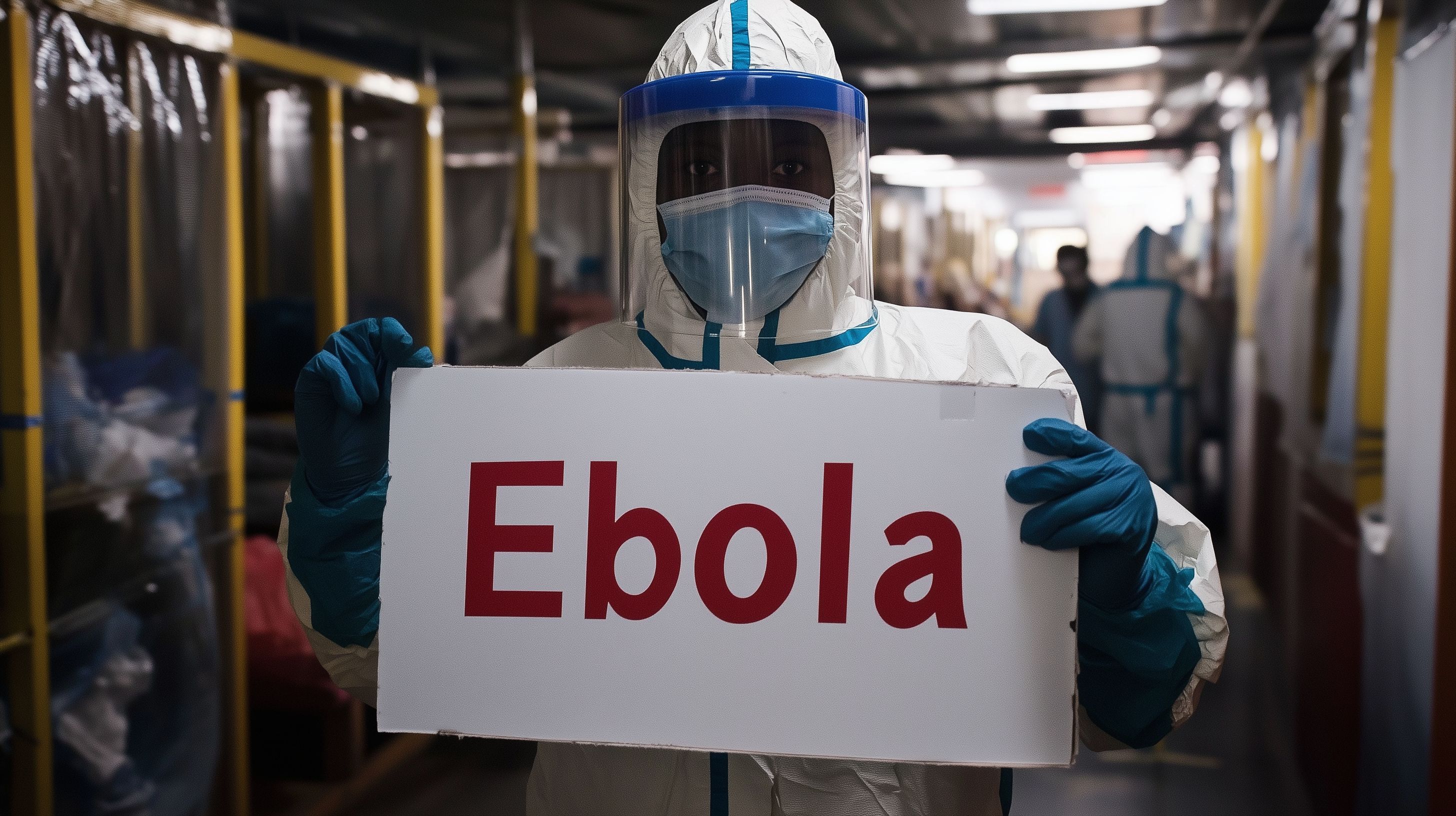 Das Bild zeigt einen Mitarbeiter des Gesundheitssystems, der in voller Schutzausrüstung einen Warnschild mit der Aufschrift 'Ebola' in einem Krankenhausflur hält. Die Person steht in einem korridorartigen Bereich mit gelben Markierungen am Boden, was auf ein Isolationsbereich oder eine Notfallstation hindeutet. Das Foto vermittelt den Ernst der Lage und die Wichtigkeit von Präventionsmaßnahmen bei einer Ebola-Epidemie. Dieses hochauflösende Stockfoto eignet sich hervorragend für Berichte, Artikel oder Social-Media-Beiträge zu Themen wie Seucheneindämmung, Krisenmanagement im Gesundheitswesen oder allgemein Infektionsrisiken. Es steht unter Creative-Commons-Lizenz zur freien Verwendung zur Verfügung.