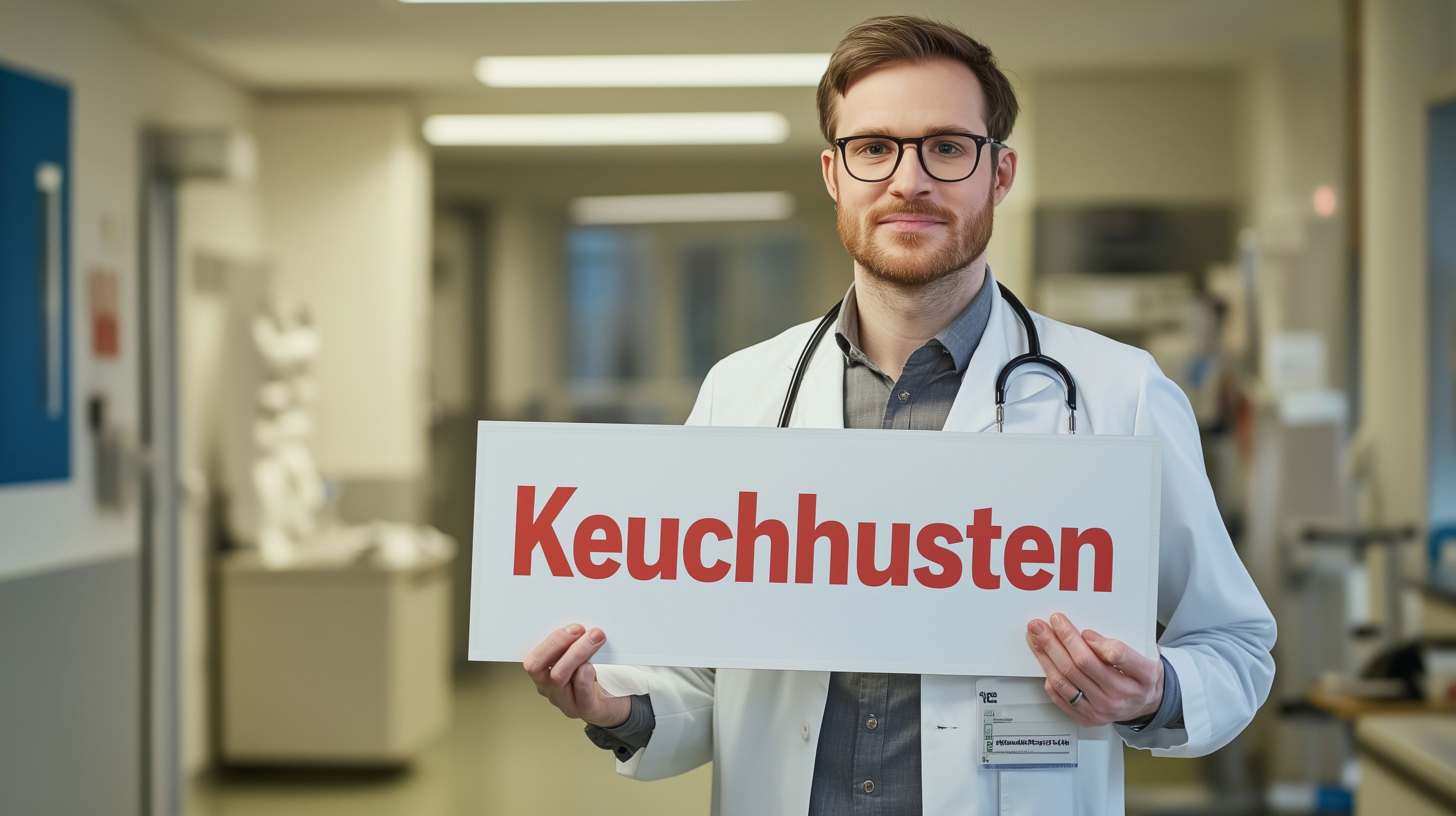 Das Bild zeigt einen Arzt in weißem Kittel, der in den Korridoren eines Krankenhauses steht und ein rotes Schild mit der Aufschrift 'Keuchhusten' hält. Der Arzt blickt ernst in die Kamera, trägt eine Brille und einen Bart. Das Foto vermittelt den Eindruck, dass der Arzt auf eine Krankheit oder Infektion aufmerksam machen möchte. Dieses kostenlose Stockfoto in hoher Auflösung unter Creative-Commons-Lizenz eignet sich hervorragend für Artikel und Beiträge zum Thema Medizin, Gesundheit und Krankheiten wie Keuchhusten. Es kann beispielsweise in Blogbeiträgen, Newslettern oder Sozialen Medien verwendet werden.