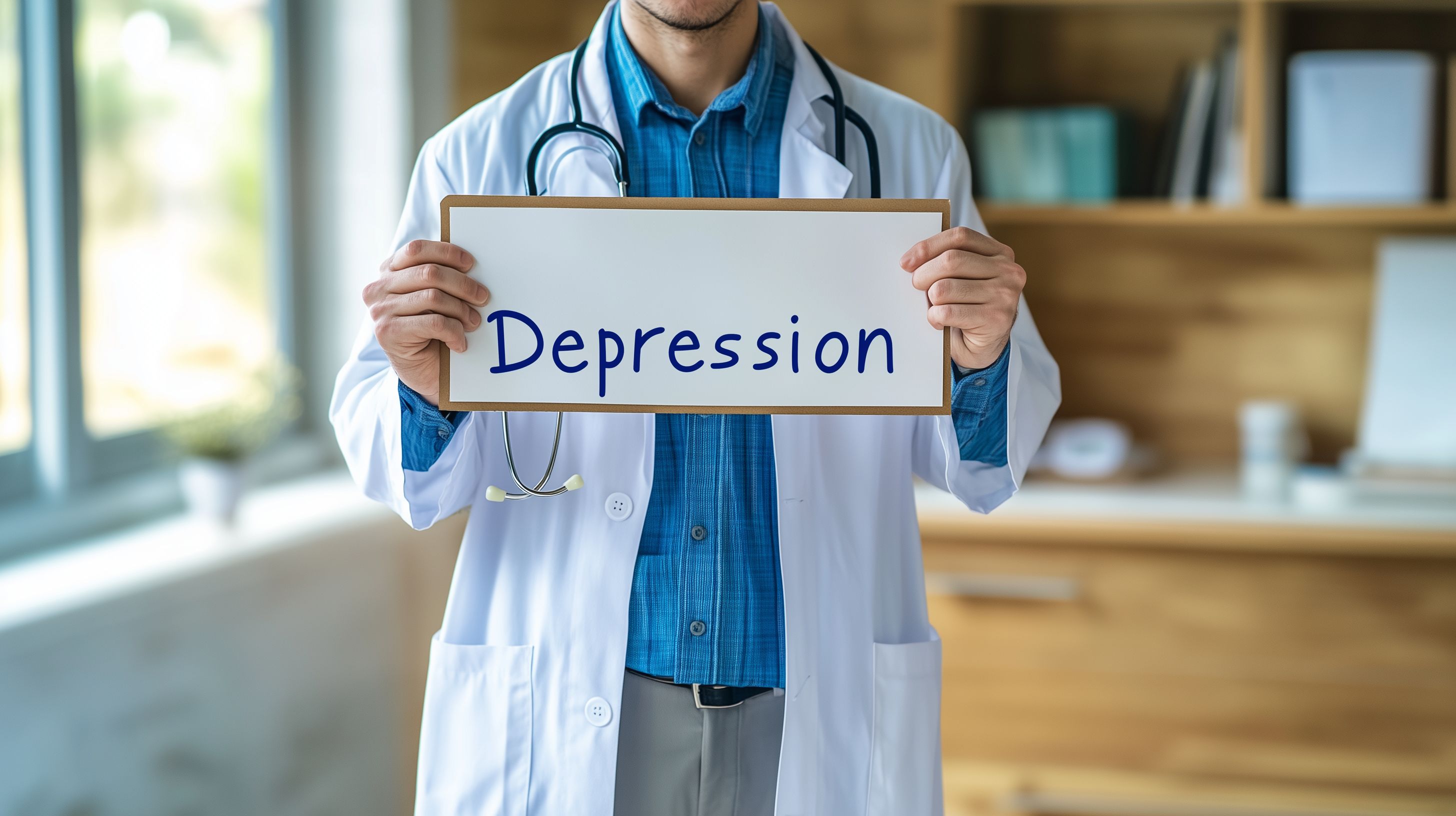 Das Bild zeigt einen Arzt in weißem Kittel, der ein Schild mit der Aufschrift 'Depression' in der Hand hält. Der Arzt steht in einer Praxisumgebung mit Bücherregalen im Hintergrund, was auf ein medizinisches Umfeld hindeutet. Das Bild vermittelt das Konzept der Behandlung und Unterstützung von Menschen mit Depressionen durch medizinisches Fachpersonal. Es eignet sich gut für den Einsatz in Beiträgen und Artikeln zum Thema psychische Gesundheit, Therapiemöglichkeiten oder Öffentlichkeitsarbeit im Gesundheitsbereich. Als kostenloses Stockfoto in hoher Auflösung und unter einer Creative-Commons-Lizenz verfügbar, kann es vielseitig in Publikationen, auf Websites oder in sozialen Medien verwendet werden.