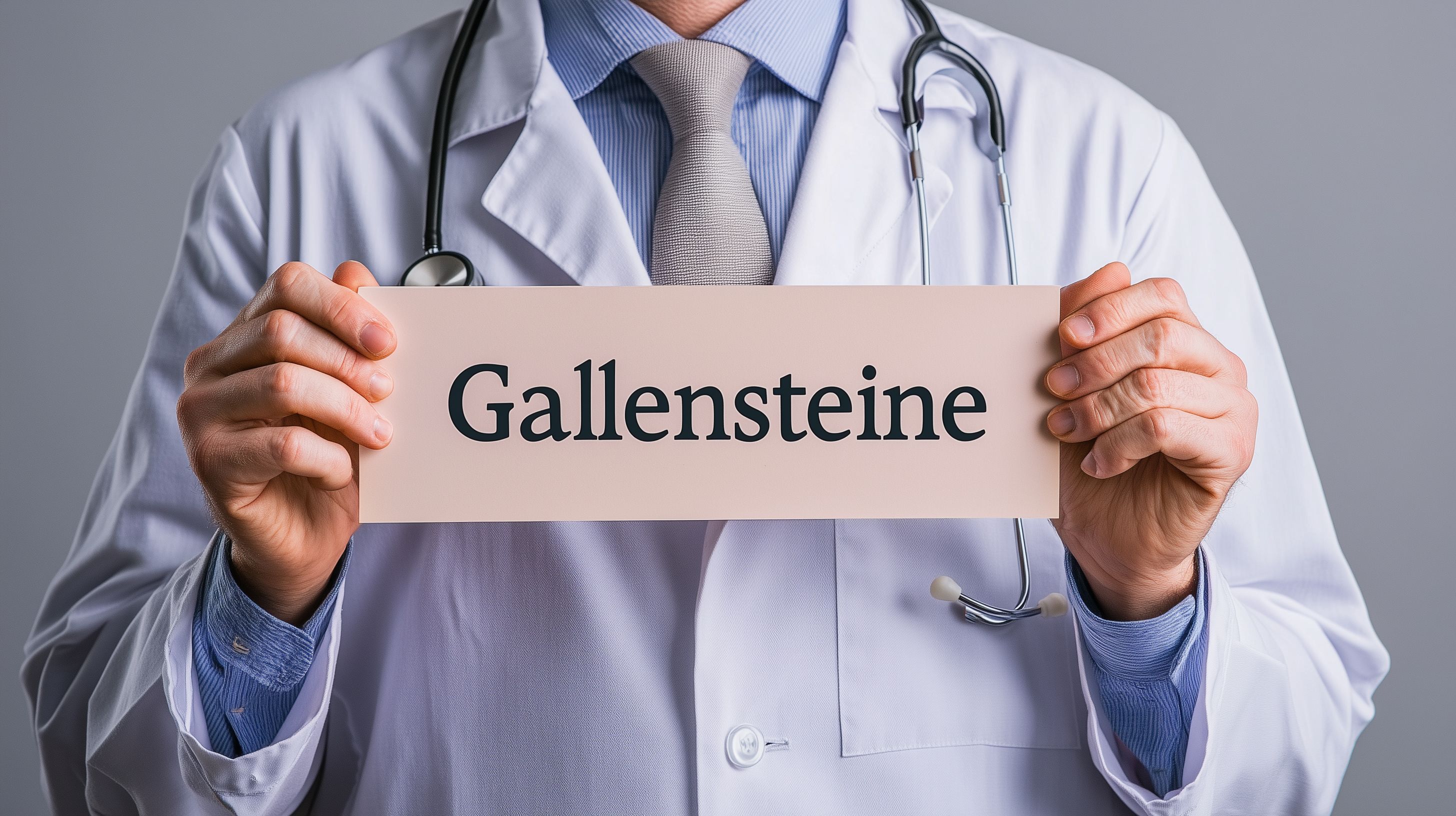 Das Bild zeigt einen Arzt in weißem Kittel, der ein Schild mit der Aufschrift 'Gallensteine' in den Händen hält. Er trägt einen blauen Anzug und eine Krawatte, was auf seine professionelle Erscheinung hinweist. Mit einem Stethoskop um den Hals signalisiert er seine medizinische Expertise. Das Bild vermittelt den Eindruck einer Diagnose oder Untersuchung in einer Arztpraxis. Dieses hochauflösende Foto eignet sich hervorragend für den Einsatz in Artikeln, Blogbeiträgen oder Werbematerialien zum Thema Gesundheit, Medizin und Krankheitsbilder. Es steht unter einer kostenlosen Creative-Commons-Lizenz zur Verfügung.