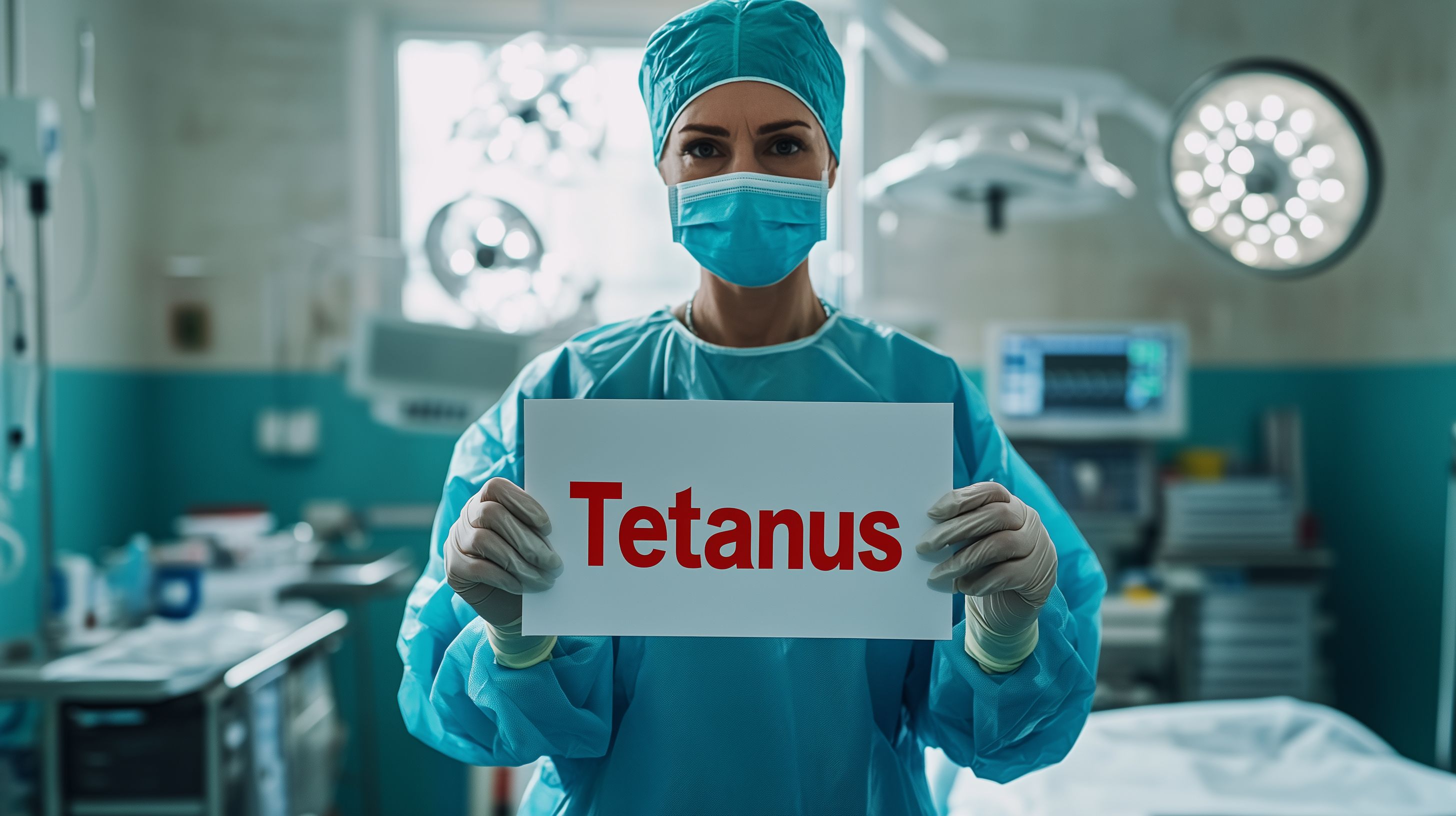 Das Bild zeigt eine Ärztin, die in voller Schutzausrüstung - Kittel, Haube und Maske - einen Warnschild mit der Aufschrift 'Tetanus' in einem modernen Operationssaal hält. Die sterile Umgebung und medizinischen Geräte im Hintergrund deuten auf eine professionelle medizinische Einrichtung hin. Das Foto vermittelt die Wichtigkeit der Prävention und Behandlung von Tetanus, einer schwerwiegenden Infektionskrankheit, die vor allem durch Verletzungen übertragen werden kann. Dieses hochauflösende, kostenlose Stockfoto eignet sich ideal für Beiträge in Blogs, Newslettern oder sozialen Medien zum Thema Gesundheit, Medizin und Infektionsschutz.
