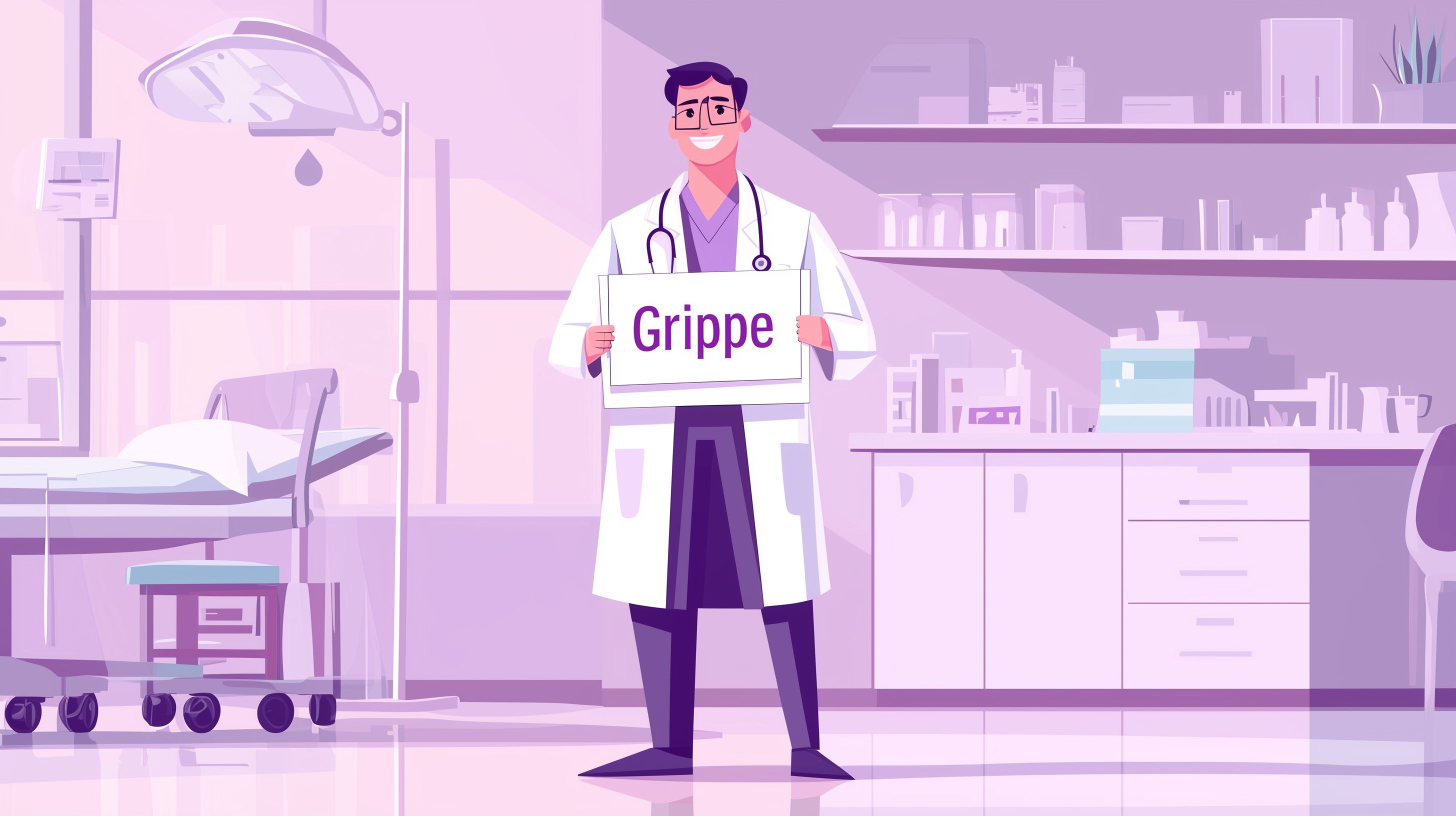 Diese detaillierte Illustration zeigt einen Arzt, der in einer typischen Krankenhausumgebung ein Schild mit der Aufschrift 'Grippe' hält. Der Arzt steht inmitten der Ausstattung eines Krankenzimmers, wie Bett, Regal mit medizinischem Equipment und anderen Utensilien. Die Farbgebung in Lila-Tönen verleiht der Szene einen ruhigen, professionellen Charakter. Dieses Stockfoto eignet sich hervorragend für Beiträge rund um Krankheiten, Gesundheitsvorsorge oder medizinische Themen, sei es in Artikeln, Newslettern oder Social-Media-Posts. Mit seiner hohen Auflösung und der Creative-Commons-Lizenz ist es kostenfrei für vielfältige Einsatzzwecke nutzbar.