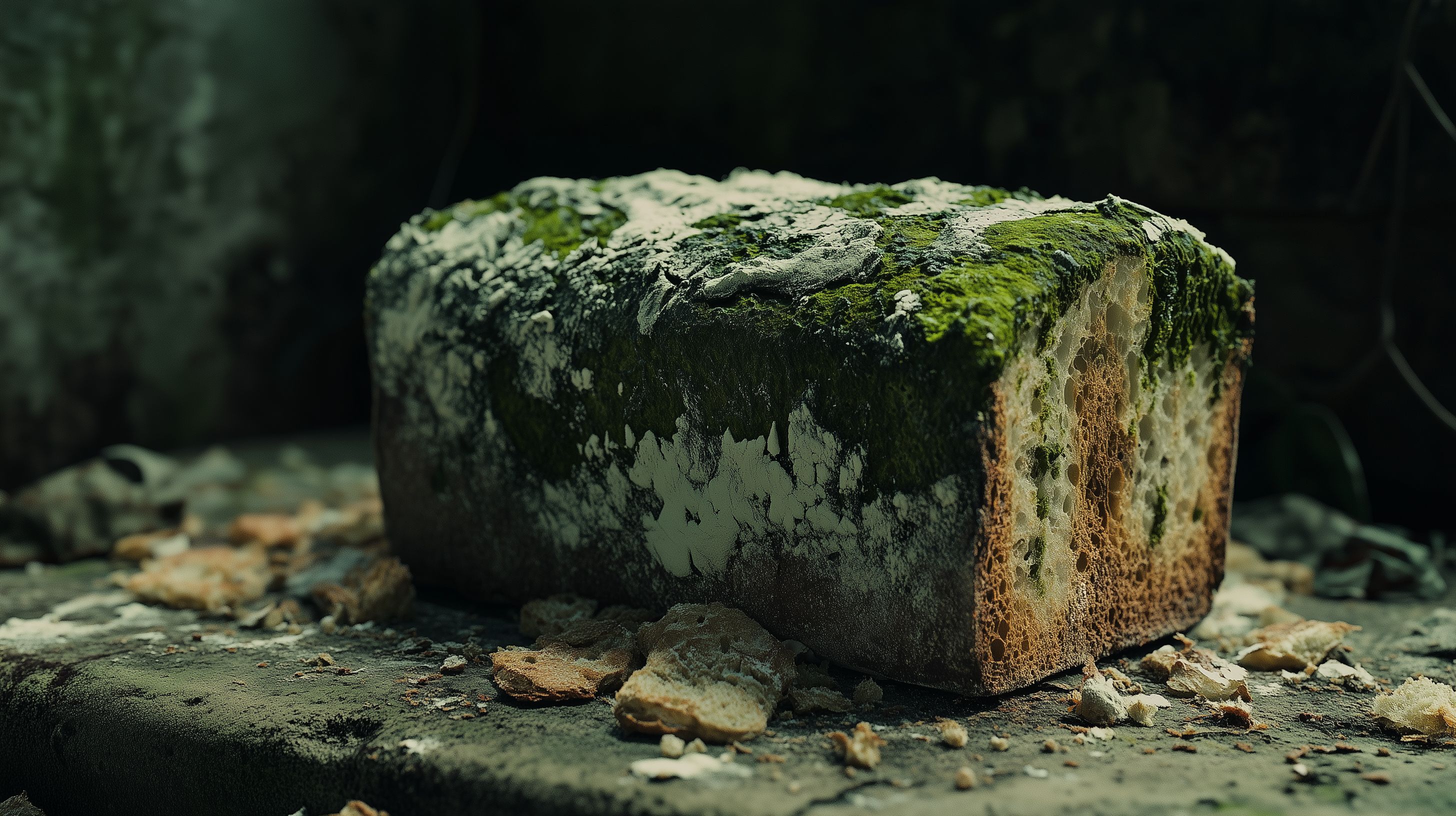 Das Bild zeigt einen Ausschnitt eines grünlich-modrig erscheinenden Brotlaibs. Auf der dunklen, rauen Oberfläche ist deutlich weißer Schimmel zu erkennen, der sich über große Teile der Brotscheibe ausgebreitet hat. Das Brot wirkt unappetitlich und verloren in der düsteren, natürlichen Umgebung. Das Foto eignet sich gut als Stockfoto für Themen rund um Lebensmittelverderb, Verwesung oder Verfall. Es ist in hoher Auflösung verfügbar und unter einer Creative-Commons-Lizenz nutzbar.