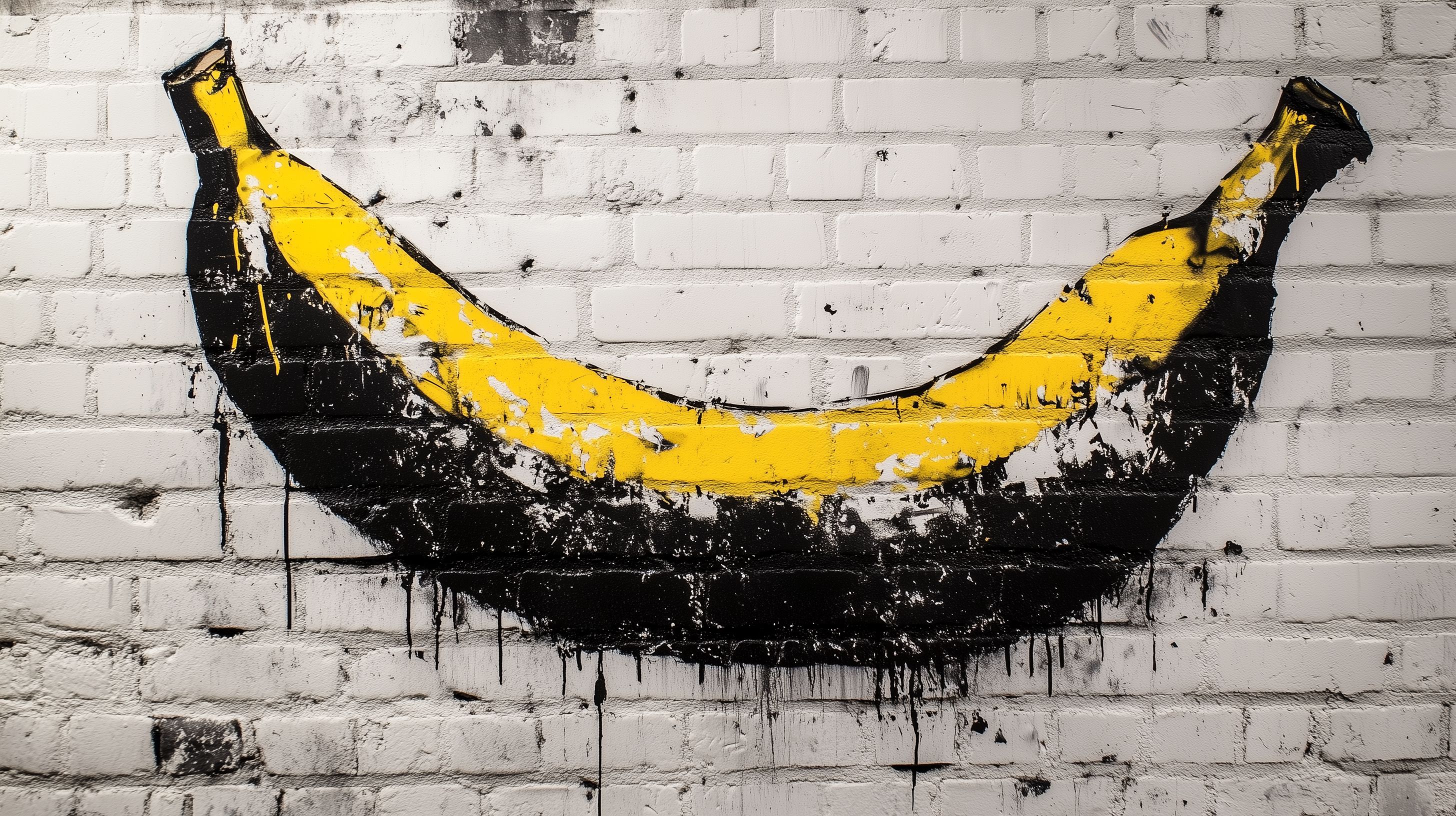 Das Bild zeigt ein urbanes Street-Art-Graffiti einer großen, gelben Banane auf einer weißen Ziegelmauer. Die Banane ist in einem abstrakten, schwarzen Stil dargestellt und scheint von Farbspritzern und Tropfen überzogen zu sein, die eine dynamische und lebendige Wirkung erzeugen. Das Kunstwerk verleiht dem ansonsten schlichten Hintergrund eine lebhafte, farbenfroh-moderne Note und könnte in vielen Kontexten wie Blogbeiträgen, Werbematerialien oder Social-Media-Posts eingesetzt werden. Als kostenloses Stockfoto in hoher Auflösung unter einer Creative-Commons-Lizenz bietet es eine einzigartige und kreative Gestaltungsmöglichkeit.
