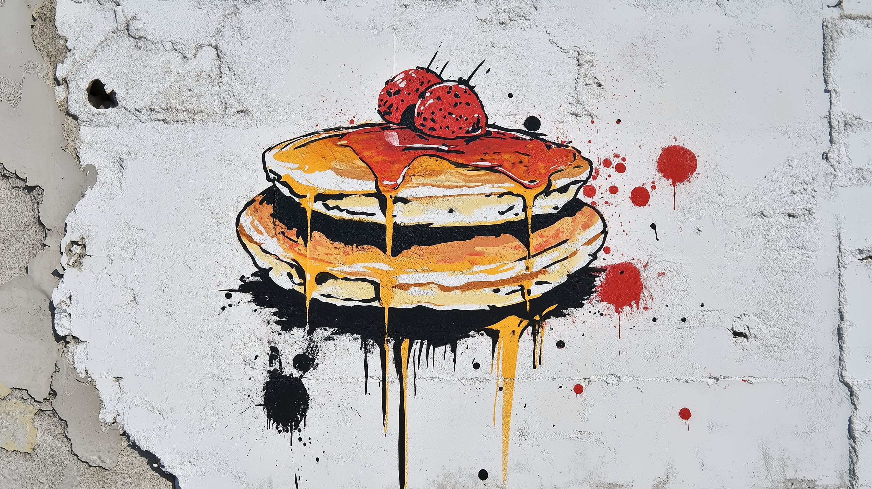 Dieses appetitlich dargestellte Kunstwerk zeigt einen kunstvoll bemalten Pfannkuchen mit Erdbeertopping, der vor einer rissigen, grauen Wand liegt. Der Kuchen ist mit gelbem Sirup übergossen, der von den roten Erdbeeren kontrastiert wird. Die lebendige, grafische Malerei verleiht dem Bild eine stimmungsvolle, urbane Atmosphäre. Diese kreative Darstellung eines Alltagsgerichts eignet sich perfekt als Stockfoto für Beiträge rund um Kulinarik, Genuss und gemütliche Momente. Das hochwertige Foto ist in hoher Auflösung und unter der Creative-Commons-Lizenz kostenlos nutzbar.