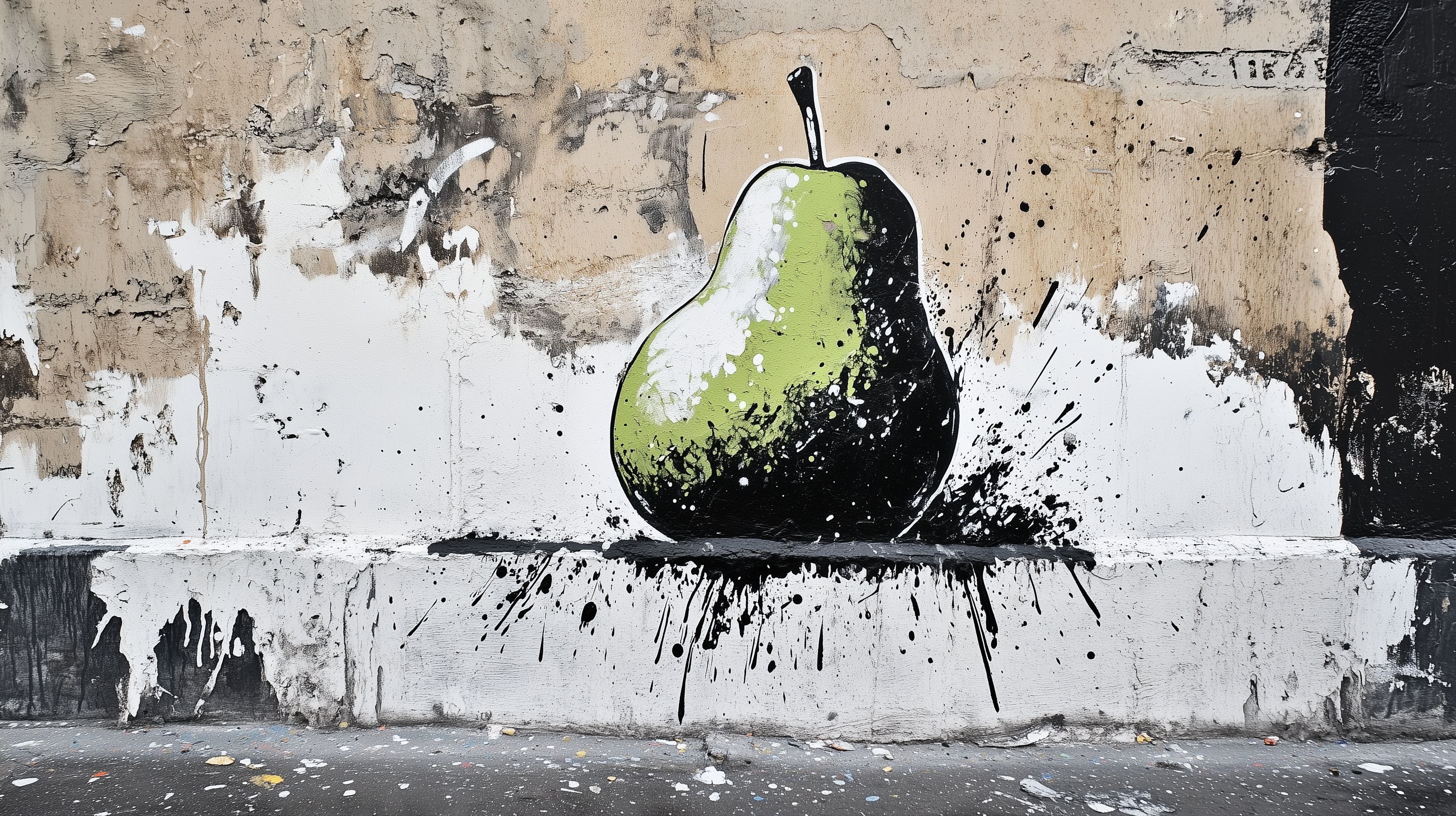 Das Bild zeigt ein kreatives Streetart-Motiv einer Birne auf einer Betonwand. Der Fokus liegt auf einer leuchtend grünen Birne, die sich stark vom dunklen, rauen Hintergrund abhebt. Der Künstler hat hier eine einzigartige Mischung aus Abstraktion, Kontrasten und organischen Formen geschaffen. Die Komposition ist dynamisch und lässt den Betrachter die Textur und Tiefe der Wand spüren. Dieses kostenlose Stockfoto in hoher Auflösung eignet sich hervorragend für Blogbeiträge, Social-Media-Posts oder Werbekampagnen im Bereich Kunst, Kreativität und urbane Ästhetik. Es steht unter einer Creative-Commons-Lizenz zur Verfügung.