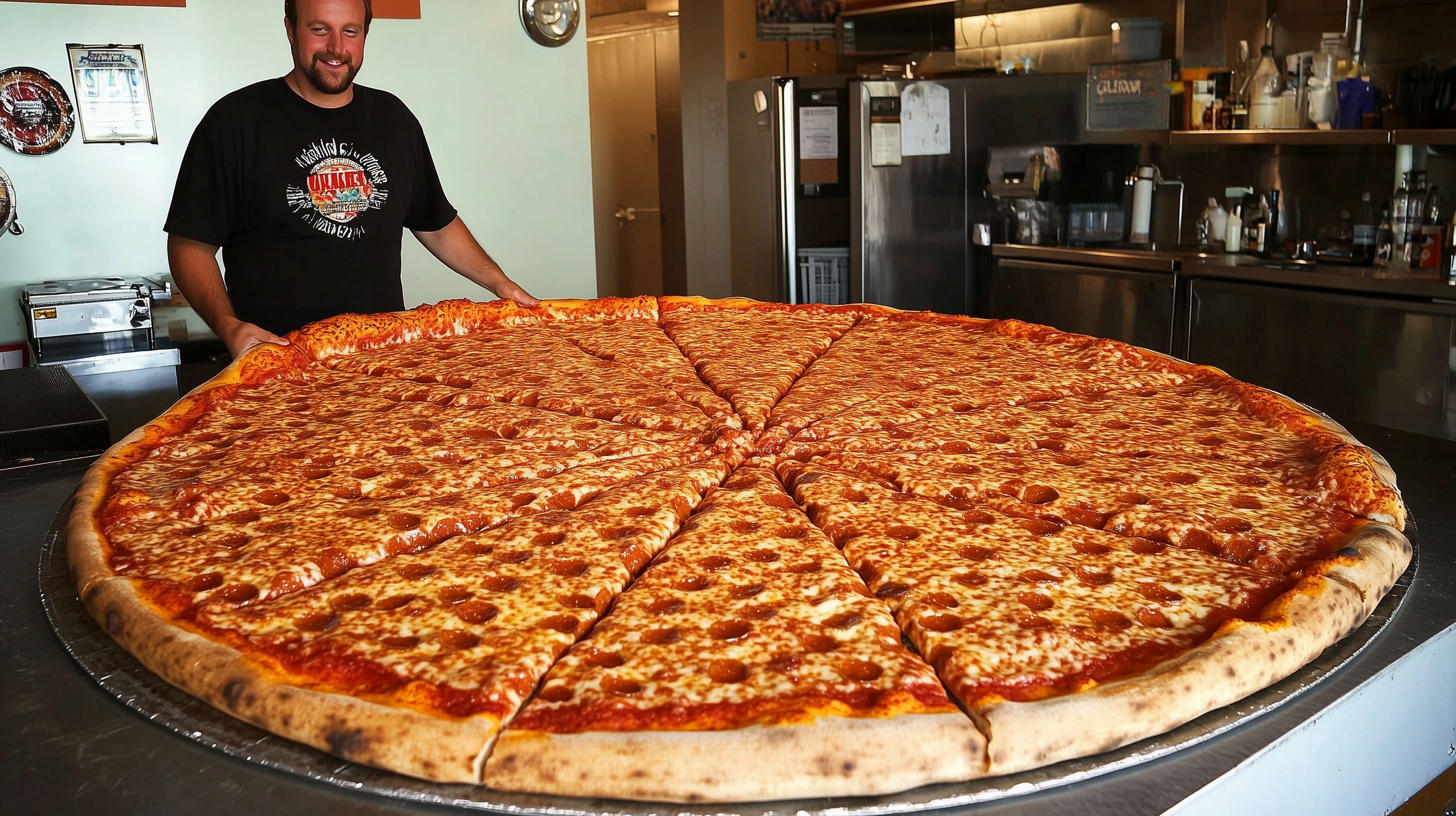 Das Bild zeigt eine riesige, frisch zubereitete Pizza in einem traditionellen amerikanischen Restaurant. Die Pizza nimmt den gesamten Tisch ein und ist perfekt geschnitten, mit einer knusprigen Kruste, reichlich Tomatensauce und geschmolzenem Käse. Im Hintergrund steht der Pizzabäcker in einer schwarzen Arbeitsuniform, was auf die hohe Qualität und Authentizität des Gerichts hinweist. Diese übergroße Pizza wäre ein idealer Blickfang für einen Lieferservice, eine Restaurantwerbung oder einen Blog-Beitrag über amerikanische Kulinarik. Als hochwertiges, kostenloses Stockfoto in hoher Auflösung und unter Creative-Commons-Lizenz ist es vielseitig einsetzbar.