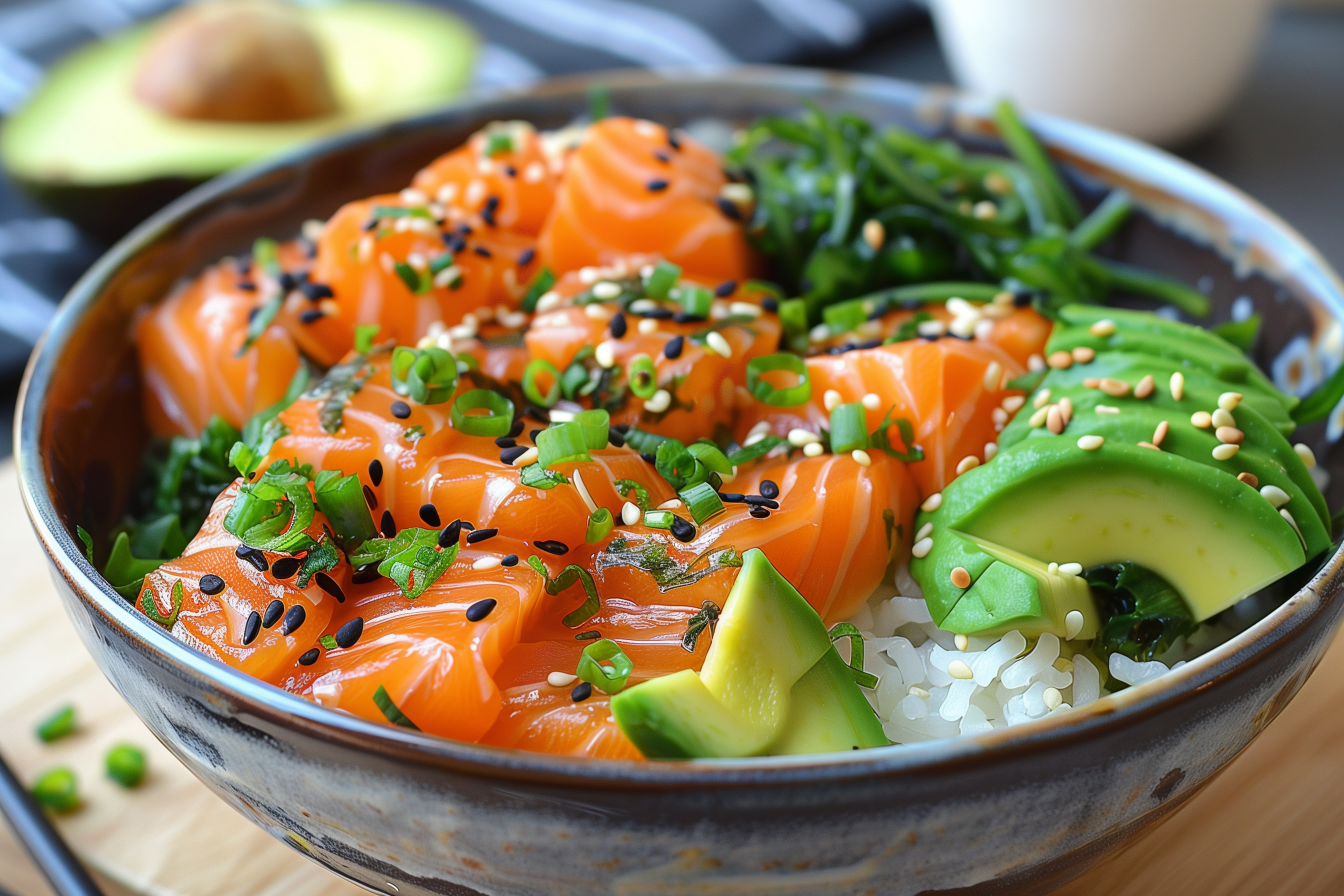 Dieses Foto zeigt eine leckere Sushi-Bowl, die mit Lachs, Avocado, Reis, Sesam und grünen Kräutern angerichtet ist. Das Bild ist aus einer leichten Draufsicht aufgenommen, wodurch die Farbkontraste und die schöne Anordnung der Zutaten perfekt zur Geltung kommen. Die Optik wirkt sehr appetitlich, frisch und gesund. Dieses Foto eignet sich hervorragend für den Einsatz in Blogs, Newslettern, Social-Media-Beiträgen oder Werbeanzeigen rund um das Thema asiatische Küche, gesunde Ernährung und leckere Rezepte. Als kostenloses Stockfoto in hoher Auflösung und unter der Creative-Commons-Lizenz ist es vielseitig einsetzbar.
