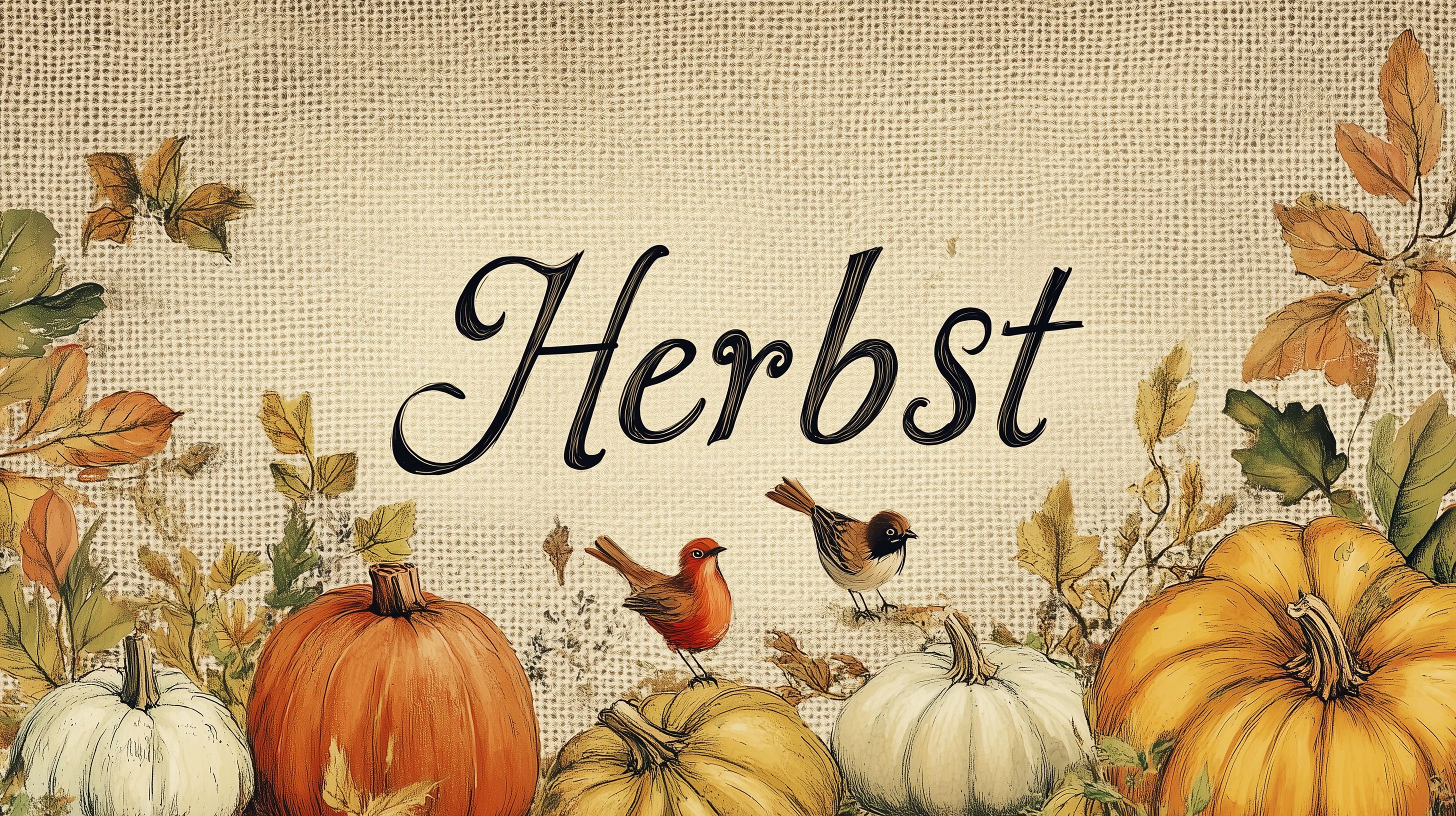 Dieses stimmungsvolle Herbstbild zeigt eine malerische Szene mit Kürbissen, Blättern und Vögeln auf einem Leinwand-Hintergrund. Die Komposition ist farbenfroh und strahlt eine gemütliche, ländliche Atmosphäre aus. Die natürlichen Materialien und Texturen verleihen dem Bild einen rustikalen Charakter, der sich perfekt für Herbst-Dekorationen, Werbung oder Illustrationen eignet.