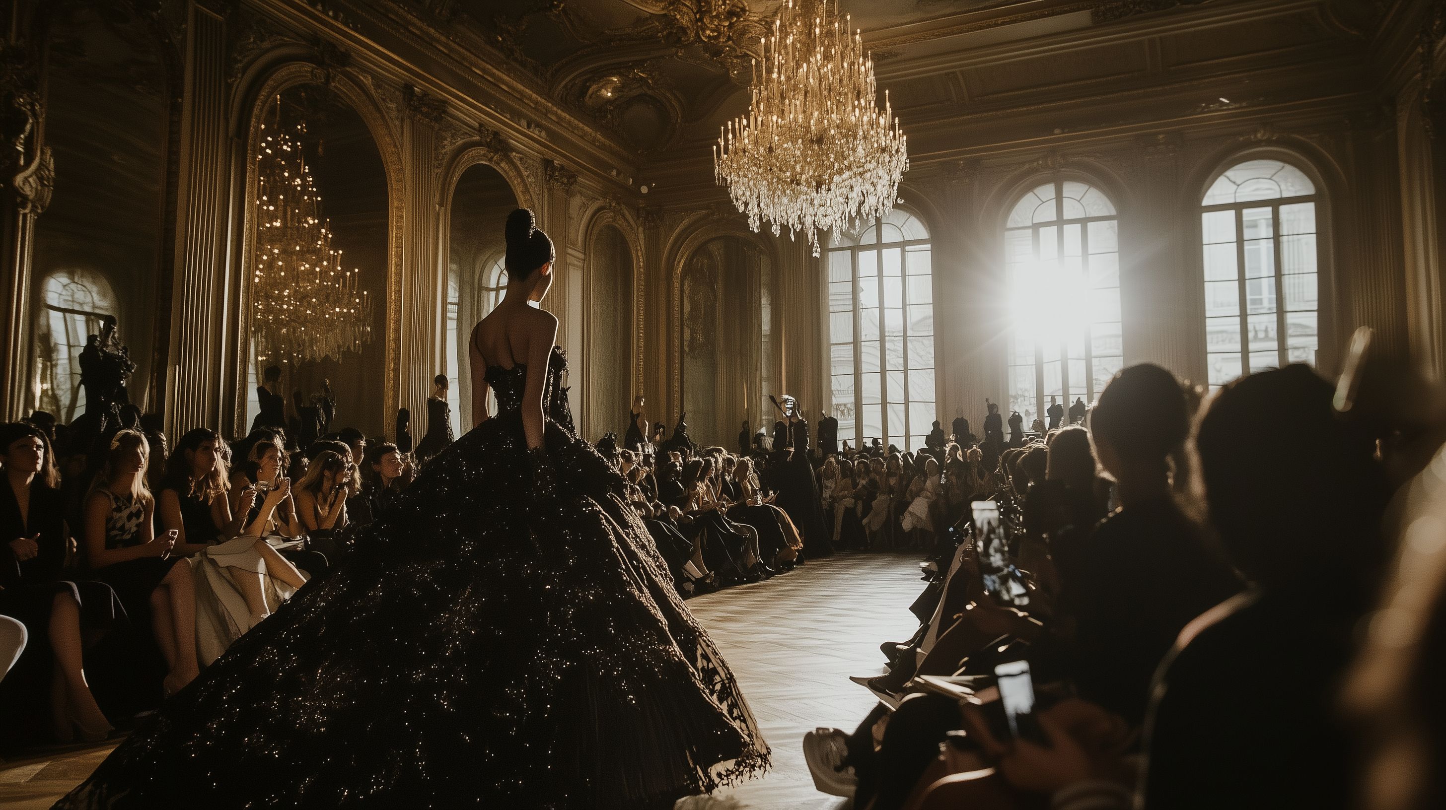 Dieses eindrucksvolle Foto zeigt eine glamouröse Modenschau in einer prunkvollen Pariser Eventlocation. Im Vordergrund ist eine Frau in einem opulenten, schwarzen Abendkleid zu sehen, die über den Laufsteg schreitet. Der gesamte Raum ist von einem warmen, goldenen Licht durchflutet und beeindruckt mit hohen Decken, einem riesigen Kristallleuchter und prachtvollen Bögen. Die Zuschauer sind elegant gekleidet und verfolgen die Präsentation mit Begeisterung. Dieses Stockfoto in hoher Auflösung eignet sich hervorragend für den Einsatz in Blogs, Newslettern oder Werbekampagnen rund um die Themen Mode, Luxus und Lifestyle. Es steht unter einer Creative-Commons-Lizenz zur freien Nutzung zur Verfügung.