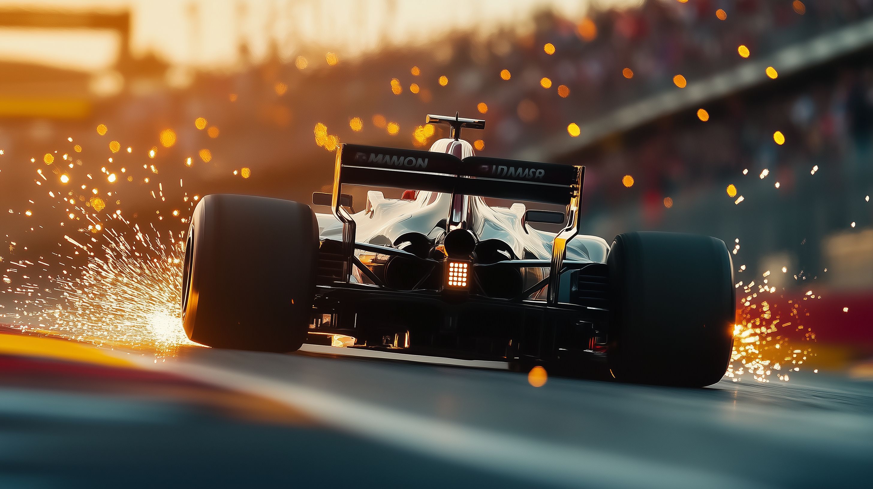 Das Bild zeigt einen Formel-1-Rennwagen, der eine scharfe Kurve auf einer Rennstrecke nimmt. Der Bolide ist in voller Fahrt und wirft Funken und Glut hinter sich auf. Der Fahrer ist in Hochkonzentration, die Spannung ist förmlich spürbar. Dieses faszinierende Foto vermittelt die Dynamik und Energie des Rennsports perfekt und eignet sich hervorragend als kostenloses Stockfoto für Blog-Beiträge, Newsletter-Designs, Social-Media-Inhalte und vielfältige Werbeanwendungen in hoher Auflösung und unter Creative-Commons-Lizenz.