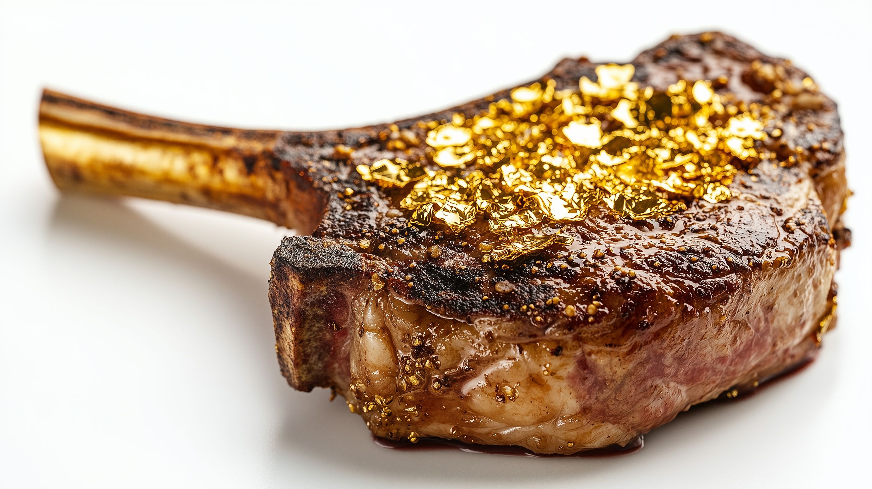 Dieses außergewöhnliche Foto zeigt ein 24 Karat vergoldetes Tomahawk-Steak in einer Nahaufnahme. Das Fleisch ist dunkelbraun mit einer knusprigen, goldverzierten Oberfläche. Die detaillierten Strukturen und Fettadern sind deutlich sichtbar, was die Qualität und Zubereitung des Premium-Fleischgerichts unterstreicht. Dieses Bild eignet sich hervorragend für den Einsatz in Blogs, Newslettern, sozialen Medien oder Werbekampagnen rund um Gastronomie, Kulinarik und exklusive Lebensmittel. Als kostenloses Hochauflösungs-Stockfoto unter Creative-Commons-Lizenz ist es vielseitig einsetzbar.