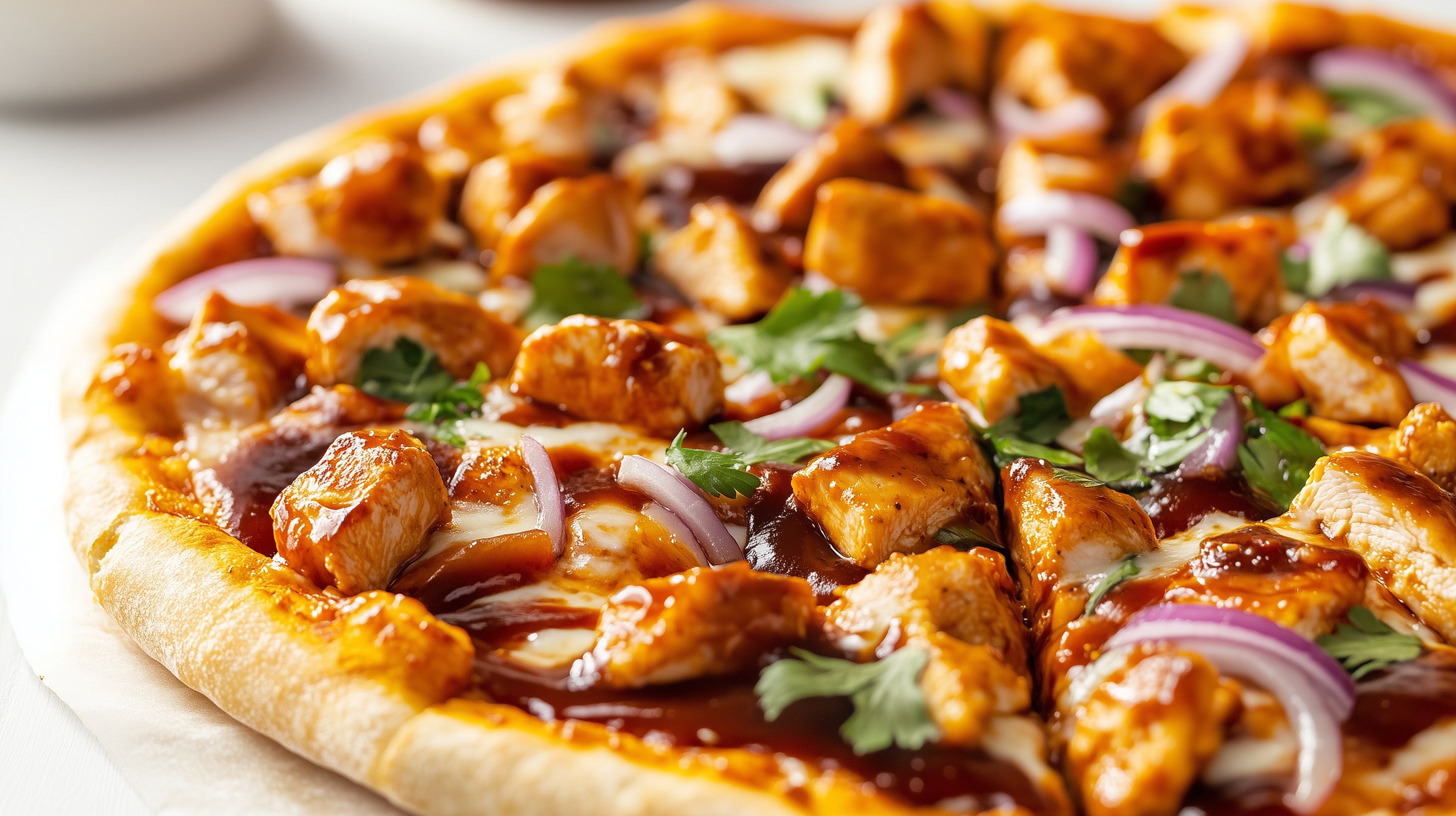 Das Bild zeigt eine köstliche BBQ-Hühnchenpizza mit saftigen, gewürzten Hühnchenstücken, roten Zwiebeln und frischer Petersilie. Der Teig ist knusprig und goldbraun, die Zutaten sind appetitlich angeordnet. Das Foto besticht durch die satten Farben, die rustikale Anmutung und die detailreiche Nahaufnahme. Diese vielseitige Pizza eignet sich hervorragend als Werbeaufnahme für Gastronomiebetriebe, Food-Blogs oder -Magazine sowie für den Einsatz in Social-Media-Kanälen. Als hochwertiges Stockfoto in hoher Auflösung und unter einer Creative-Commons-Lizenz stehend, kann es flexibel und kostenfrei genutzt werden.