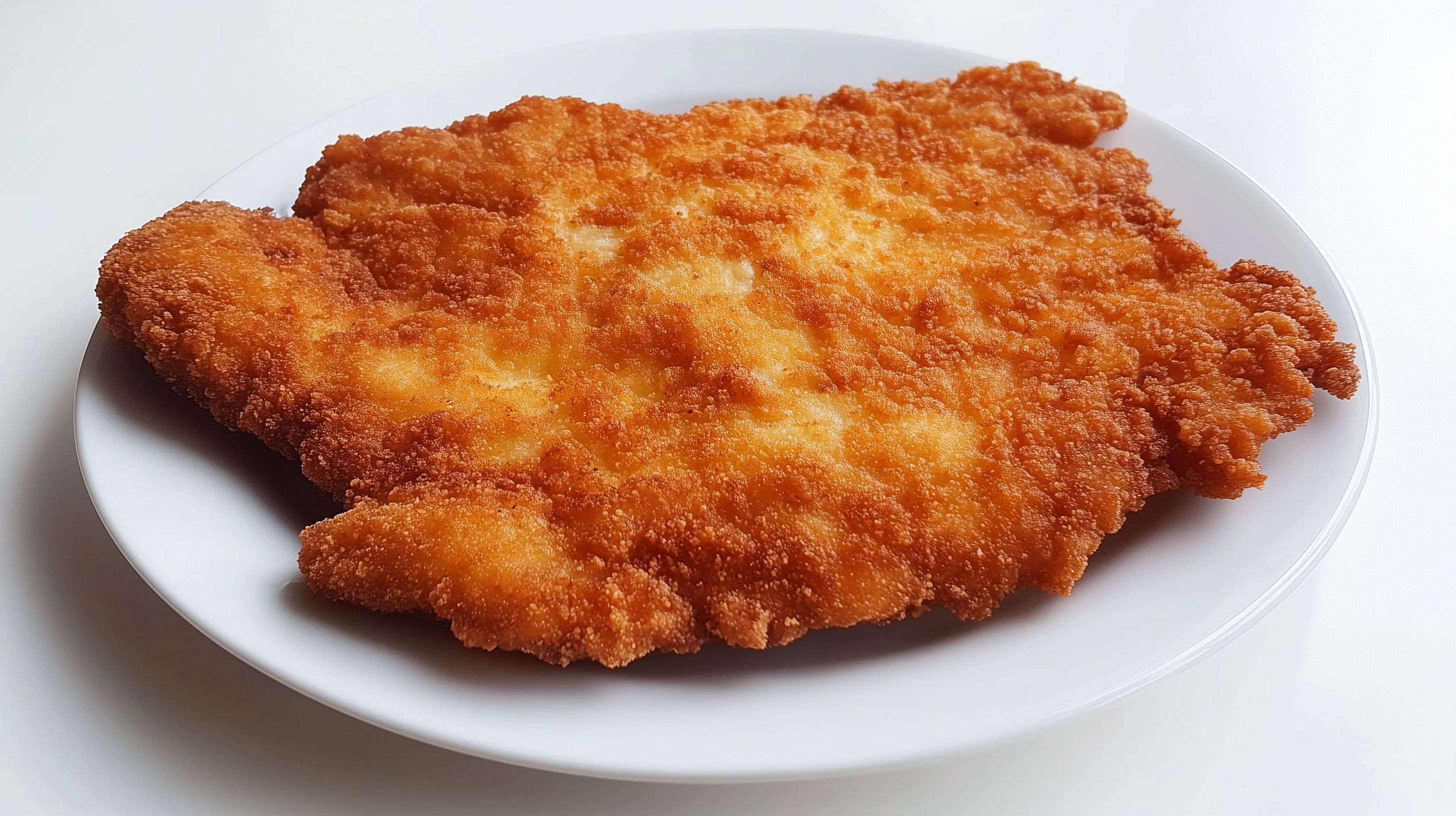 Das Bild zeigt ein frisch zubereitetes, knuspriges frittiertes Schnitzel auf einem weißen Teller. Das goldbraun ausgebackene Fleisch ist in seiner ganzen Pracht zu sehen, mit einer knusprigen Panade, die einen appetitlichen Kontrast zur Saftigkeit des Inneren bildet. Der weiße Teller dient als einfacher, aber effektiver Hintergrund, um die Hauptdarstellerin, das Schnitzel, in den Fokus zu rücken. Dieses hochauflösende Stockfoto eignet sich hervorragend für den Einsatz in Blogbeiträgen, Social-Media-Posts, Werbekampagnen oder Menükarten im gastronomischen Bereich. Als kostenloses Creative-Commons-Foto steht es für vielfältige Verwendungsmöglichkeiten zur Verfügung.