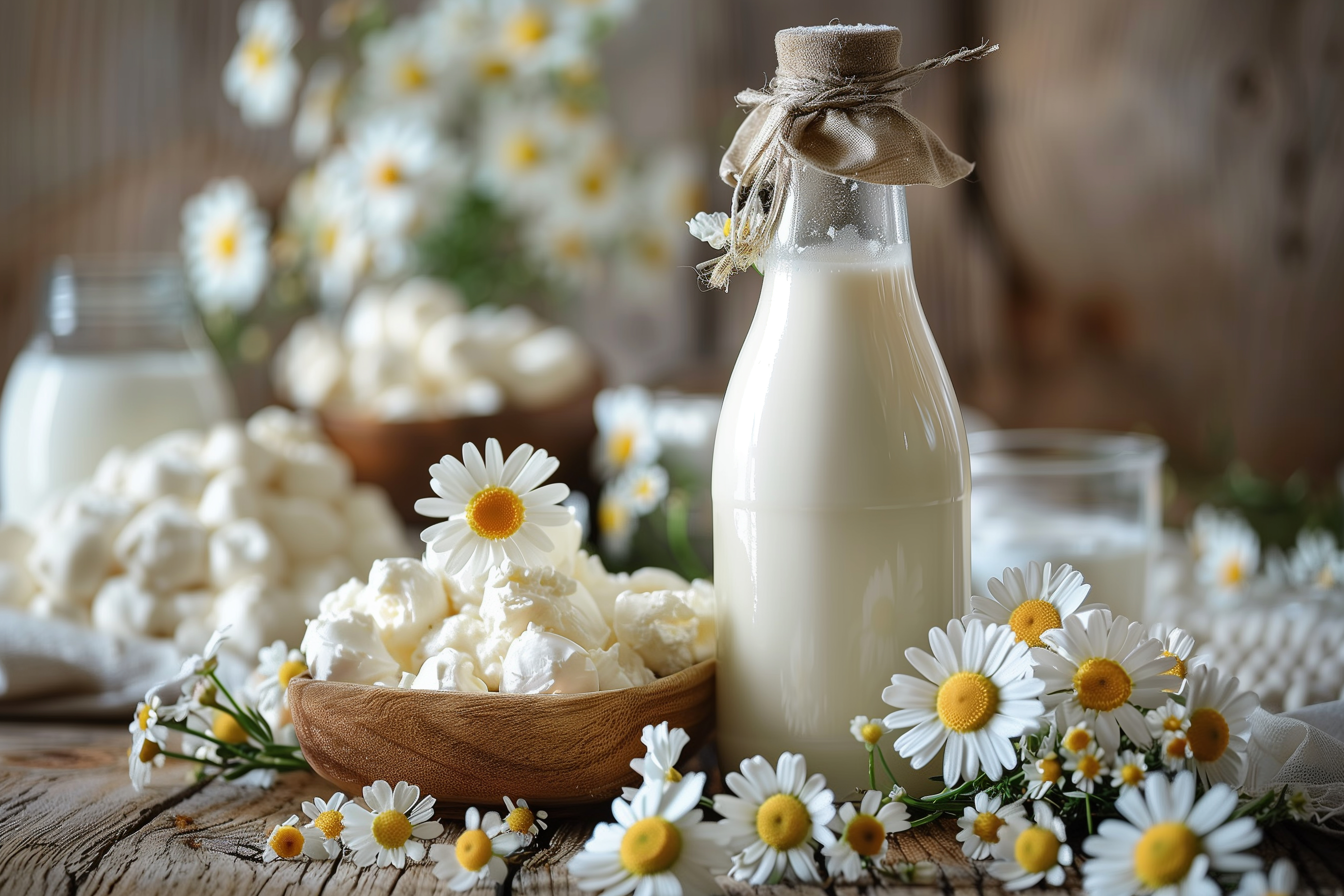 Das Foto zeigt eine idyllische Szenerie mit einer Milchflasche, Blumen und anderen natürlichen Elementen. Im Vordergrund befindet sich eine Holzschüssel voller Milchprodukte, umgeben von Gänseblümchen und anderen Wildblumen. Im Hintergrund steht eine dekorativ gebundene Milchflasche, die von Blumen umgeben ist. Die Komposition ist harmonisch und betont die Natürlichkeit und Frische der Zutaten. Dieses kostenlose Stockfoto in hoher Auflösung kann perfekt für Blogs, Newsletter, Social-Media-Beiträge oder Werbematerialien rund um Themen wie Landwirtschaft, Biolebensmittel oder ländliche Ästhetik eingesetzt werden. Es steht unter einer Creative-Commons-Lizenz zur Verfügung.