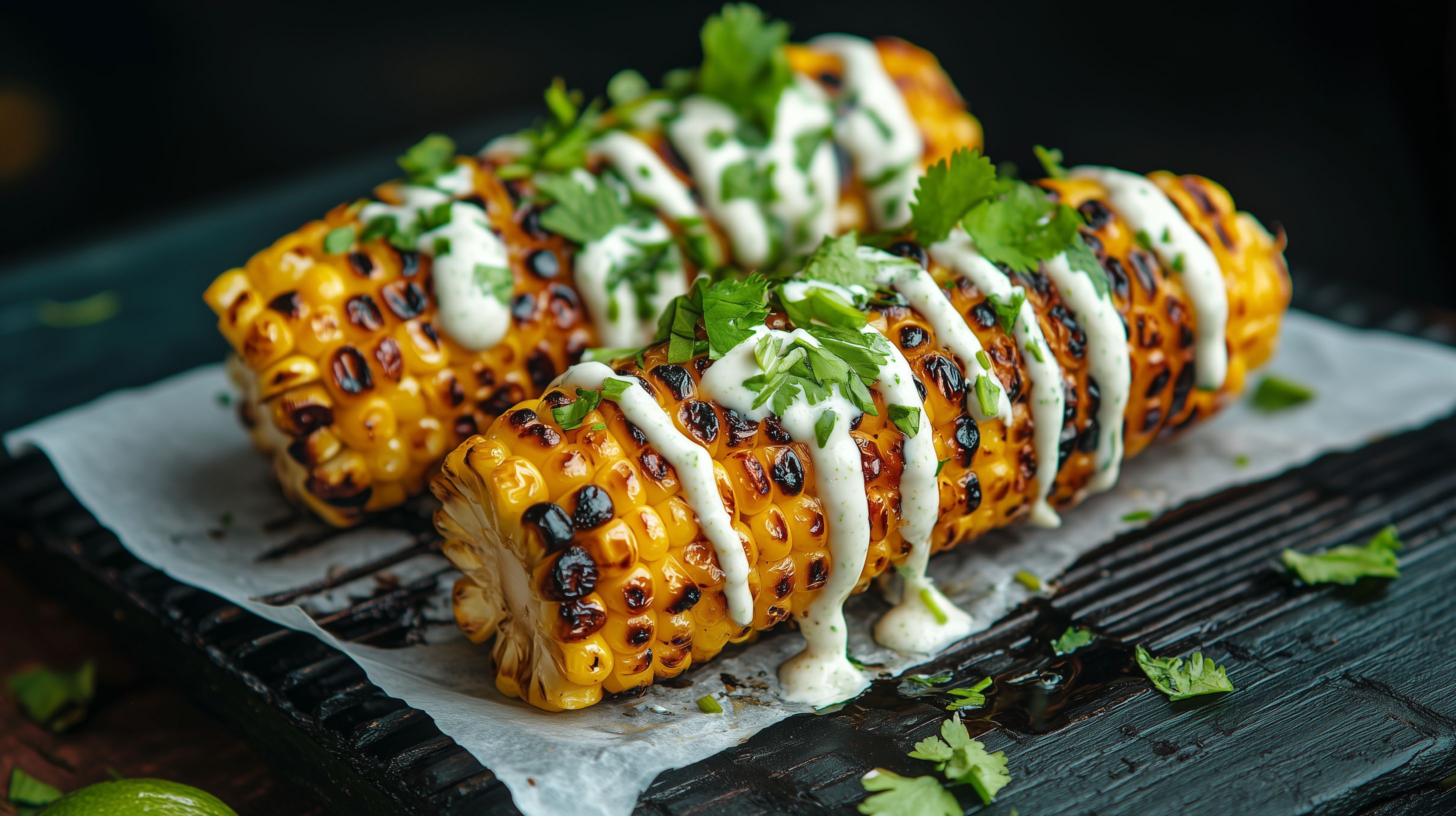 Das Bild zeigt geschmackvoll gegrillte Maiskörner, die auf einem dunklen Untergrund angerichtet sind. Die Maiskörner sind sorgfältig in Scheiben geschnitten und mit einer cremigen Kräutersoße garniert, die eine appetitliche Optik verleiht. Das Arrangement wirkt rustikal und authentisch, als würde es direkt aus einer Straßenküche stammen. Die warmen Farbtöne der gegrillten Oberfläche und die frischen Kräuter erzeugen ein einladendes Gesamtbild. Dieses Stockfoto eignet sich hervorragend für den Einsatz in Blogs, Newslettern oder Social-Media-Beiträgen zum Thema Sommerküche, mexikanische Küche oder leckere Grillrezepte. Das Bild ist in hoher Auflösung und unter einer Creative-Commons-Lizenz verfügbar.