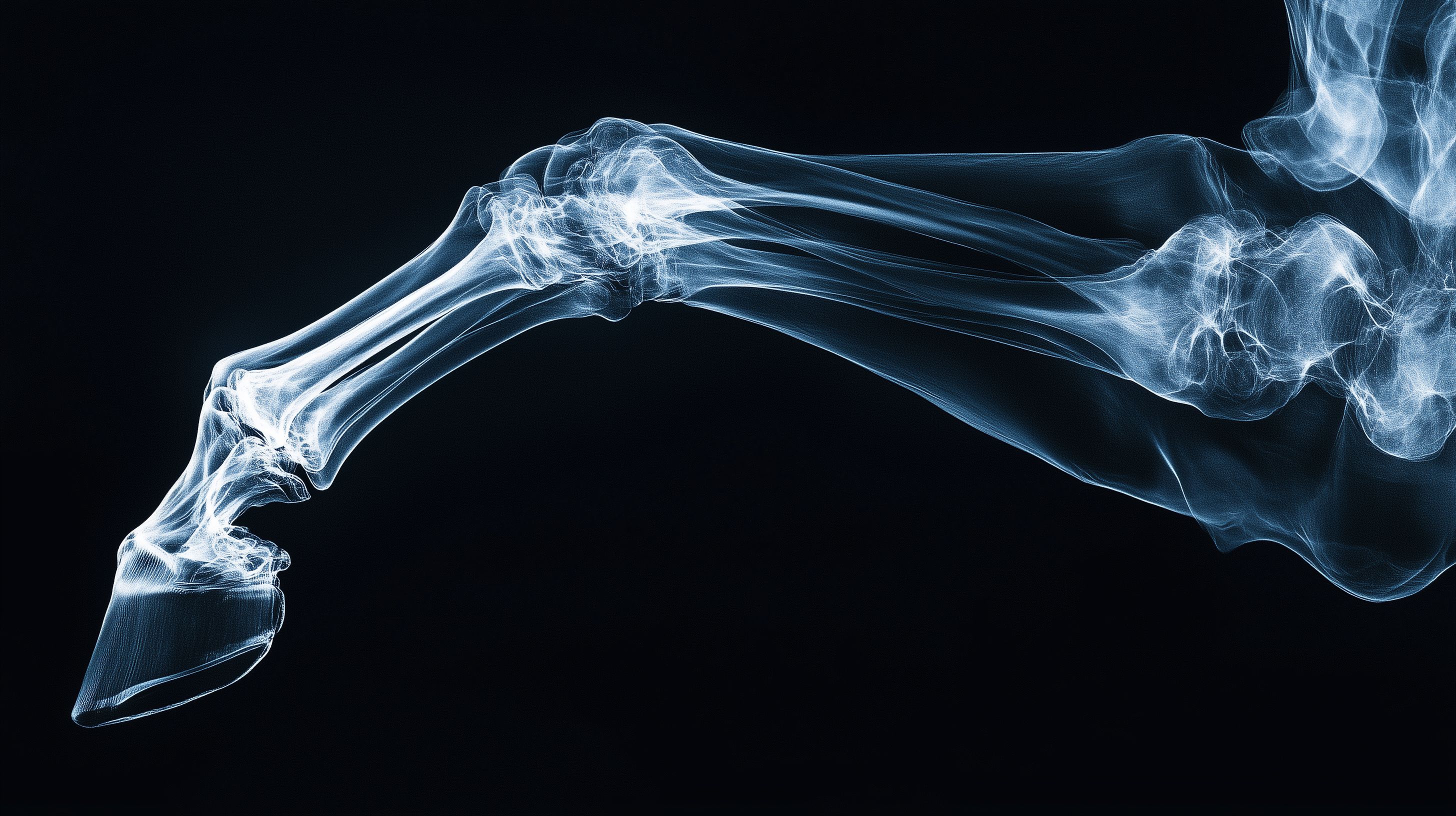 Das Bild zeigt eine detaillierte Röntgenaufnahme eines Pferdebeins. Die Knochen und Gelenke sind deutlich zu erkennen und heben sich in Schwarz-Weiß-Kontrasten von der dunklen Umgebung ab. Die Aufnahme bietet einen medizinischen, wissenschaftlichen Blick auf die innere Anatomie des Pferdebeins und könnte für Blogs, Newsletter, Soziale Medien oder Werbematerialien zum Thema Veterinärmedizin, Gesundheit oder Forschung eingesetzt werden. Dieses hochauflösende, kostenfreie Stockfoto steht unter einer Creative-Commons-Lizenz zur Verfügung.
