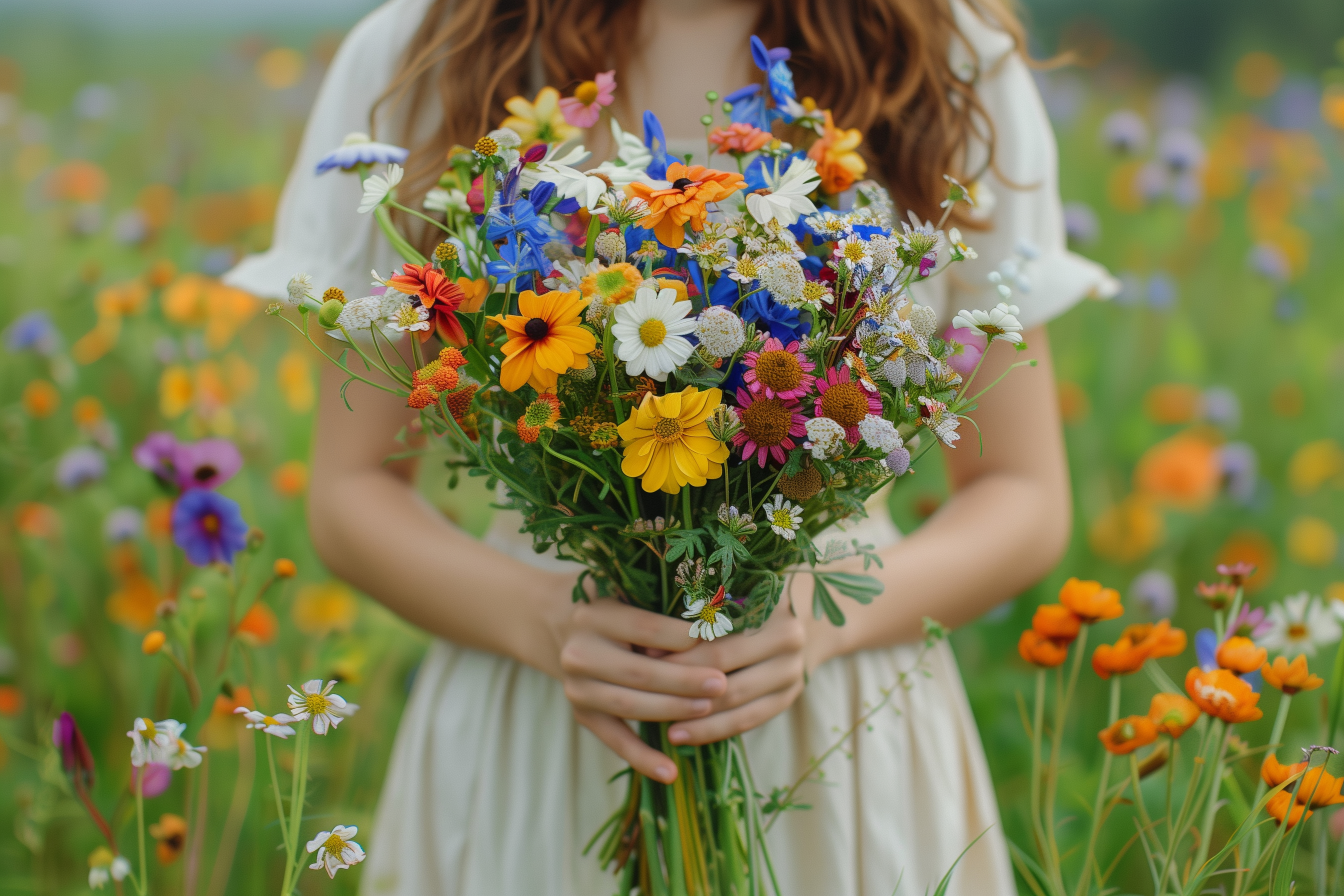 Das Bild zeigt einen großen, bunten Blumenstrauß, der von einer jungen Frau in einem Blumenfeld gehalten wird. Der Strauß besteht aus verschiedenen Blüten wie Gänseblümchen, Margeriten, Sonnenblumen und weiteren Wildblumen in kräftigen Farben wie Gelb, Orange, Blau und Weiß. Die Frau trägt ein weißes Kleid und hat ihr langes, dunkles Haar offen. Der Hintergrund ist verschwommen und zeigt eine grüne Wiese mit weiteren Blüten. Das Foto strahlt eine natürliche, frische und fröhliche Stimmung aus.