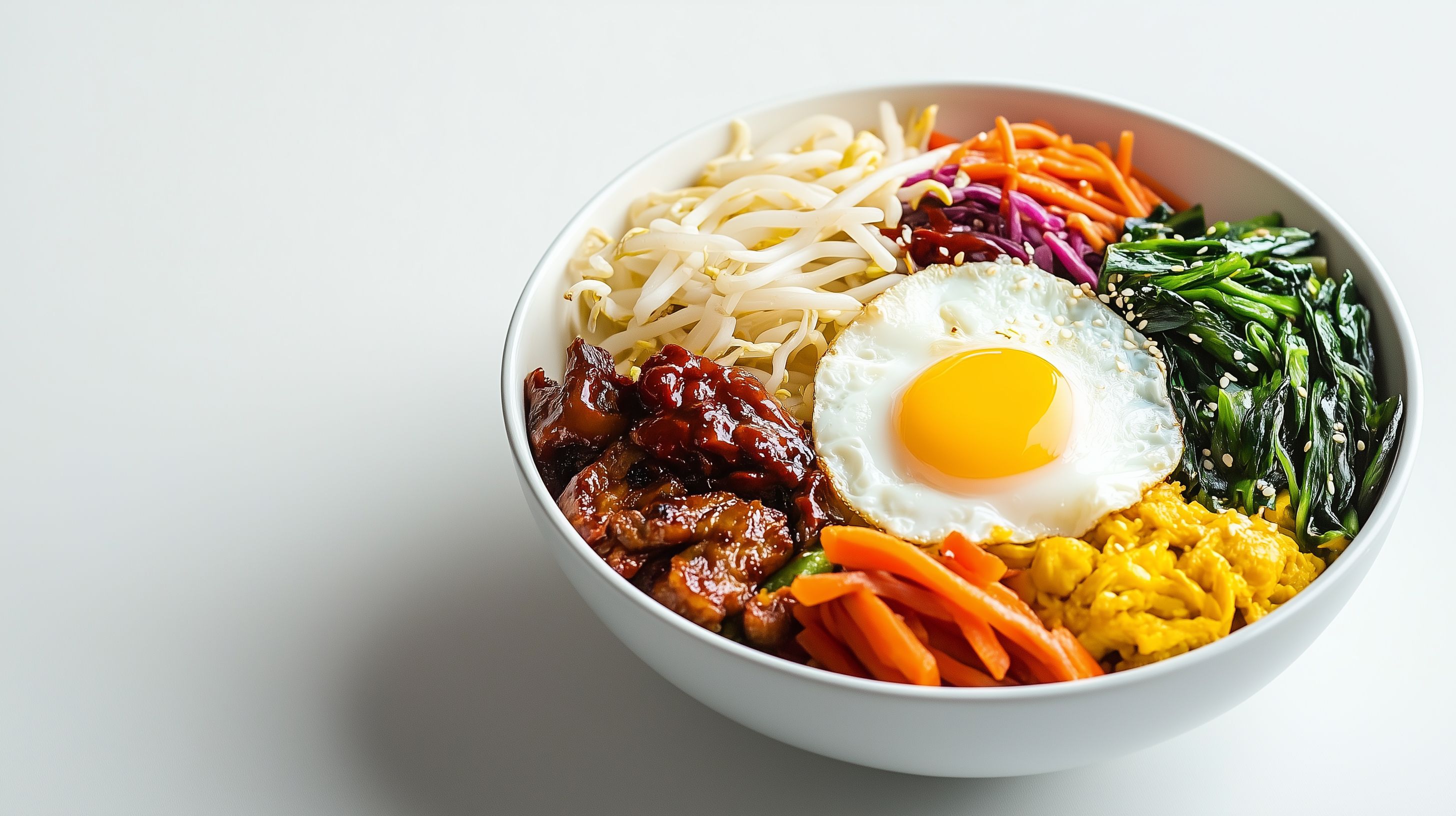 Dieses Foto zeigt einen appetitlichen Bibimbap-Reis, eine traditionelle koreanische Speise, die mit buntem Gemüse, Ei und einer würzigen Sauce angerichtet wurde. Die Zutaten sind in einer weißen Schüssel ansprechend arrangiert, sodass sich ein farbenfrohes, harmonisches Bild ergibt. Das Foto eignet sich hervorragend als hochwertiges Stockfoto für kulinarische Beiträge in Blogs, auf Social-Media-Kanälen oder in Werbekampagnen rund um das Thema gesunde, ausgewogene Ernährung. Das Bild ist in hoher Auflösung und unter einer Creative-Commons-Lizenz verfügbar.