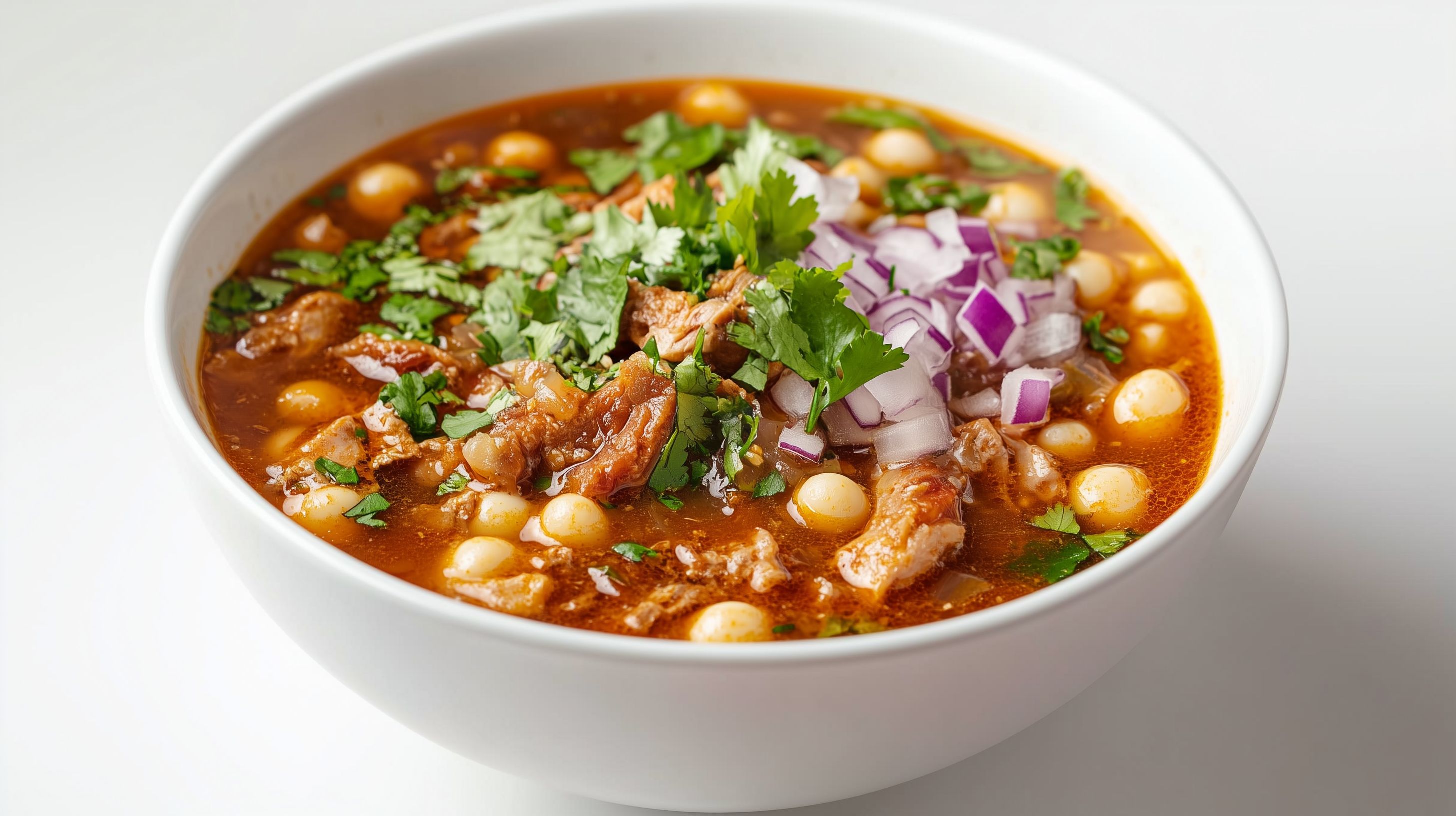 Dieses appetitliche Foto zeigt eine authentische mexikanische Pozole-Suppe, ein traditionelles Gericht mit Kichererbsen, Schweinefleisch, Tomaten und frischen Kräutern. Die Suppe hat eine kräftig-würzige rote Farbe und ist mit Zwiebeln, Koriander und anderen Zutaten garniert. Das Foto bietet eine appetitliche Ansicht dieses köstlichen mexikanischen Gerichts und kann perfekt für Rezeptbeiträge, Restaurantmenüs oder Food-Blogs verwendet werden. Als hochwertiges Stockfoto in hoher Auflösung und unter Creative-Commons-Lizenz ist es für vielfältige Zwecke kostenlos nutzbar.