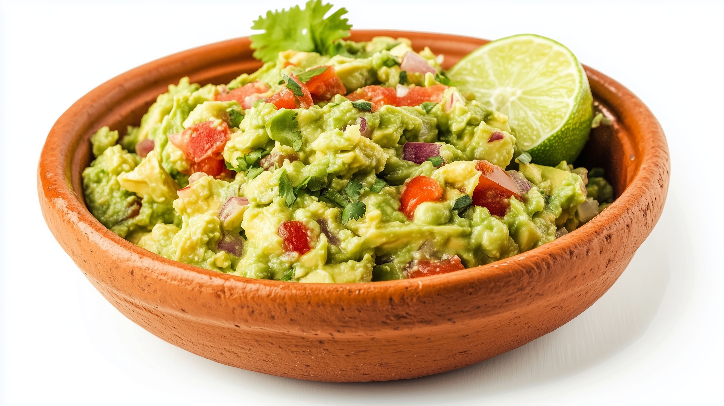 Dieses farbenfrohe Bild zeigt eine rustikale Tonschüssel voller frisch zubereitetem Guacamole. Die cremige, grüne Avocadomasse ist mit würzigen Zutaten wie Tomaten, Limette und Kräutern vermischt. Das Gericht versprüht einen authentisch-mexikanischen Charme und eignet sich perfekt als Dip, Beilage oder Zutat für allerlei Gerichte. Das hochwertige Stockfoto in hoher Auflösung ist unter einer Creative-Commons-Lizenz kostenlos nutzbar, zum Beispiel für Blogs, Newsletter, Social-Media-Beiträge oder Werbematerialien.