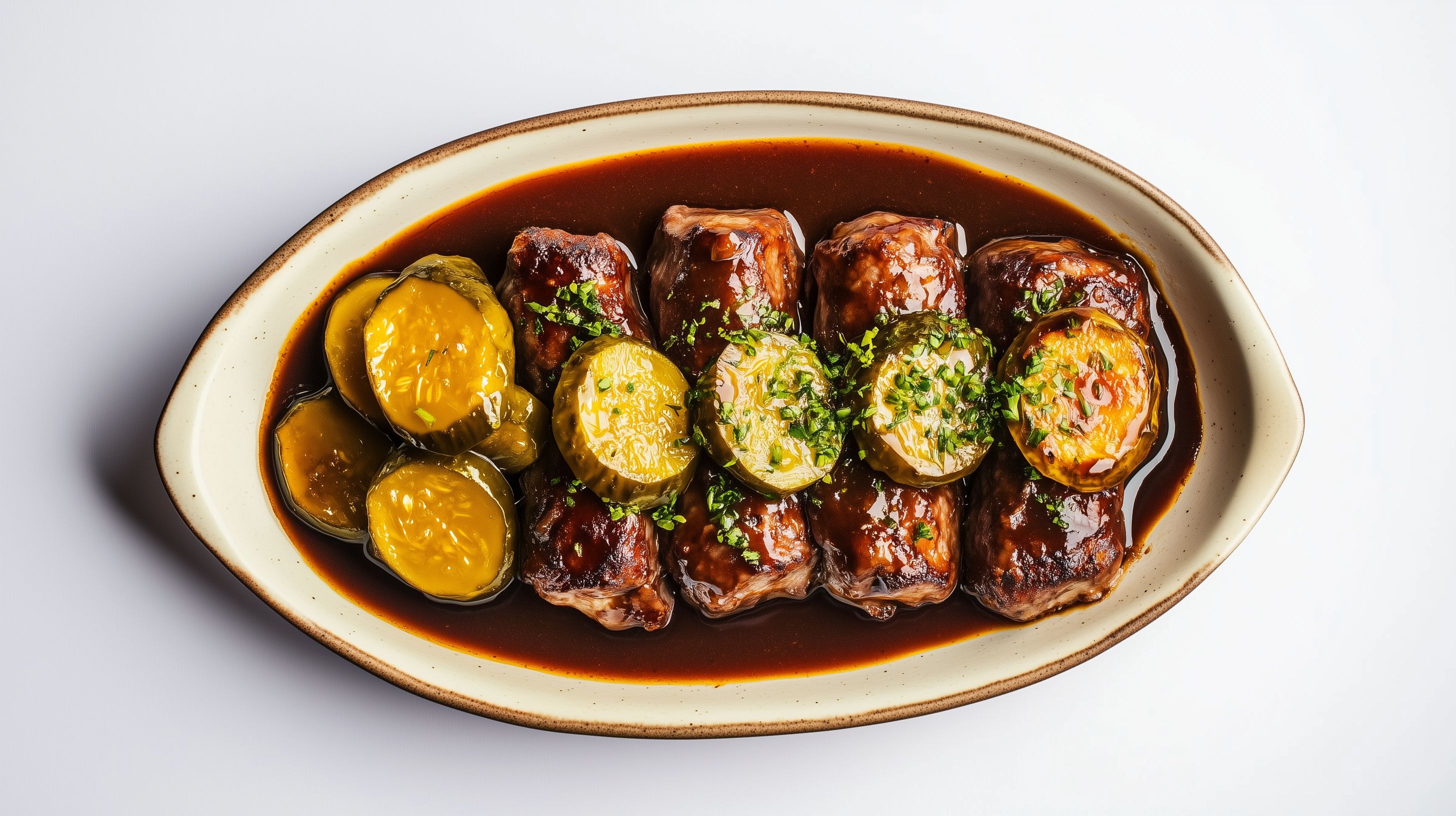 Dieses appetitliche Foto zeigt ein traditionelles, rustikal präsentiertes Fleischgericht - saftige Rouladen, eingebettet in einer würzigen Sauce und umgeben von eingelegtem Gemüse wie Essiggurken. Die ovale Keramikschale verleiht dem Gericht einen gemütlichen, heimischen Charakter. Die Komposition aus den dunkelbraunen Rouladen, der glänzenden Sauce und den leuchtenden Gelbtönen des Gemüses ergibt ein harmonisches Gesamtbild, das zum Genießen einlädt. Dieses hochwertige Stockfoto ist perfekt geeignet für Rezeptblogbeiträge, Kochbücher, Werbematerial für Gastronomie und Lebensmittel sowie Social-Media-Postings rund um das Thema Kulinarik.