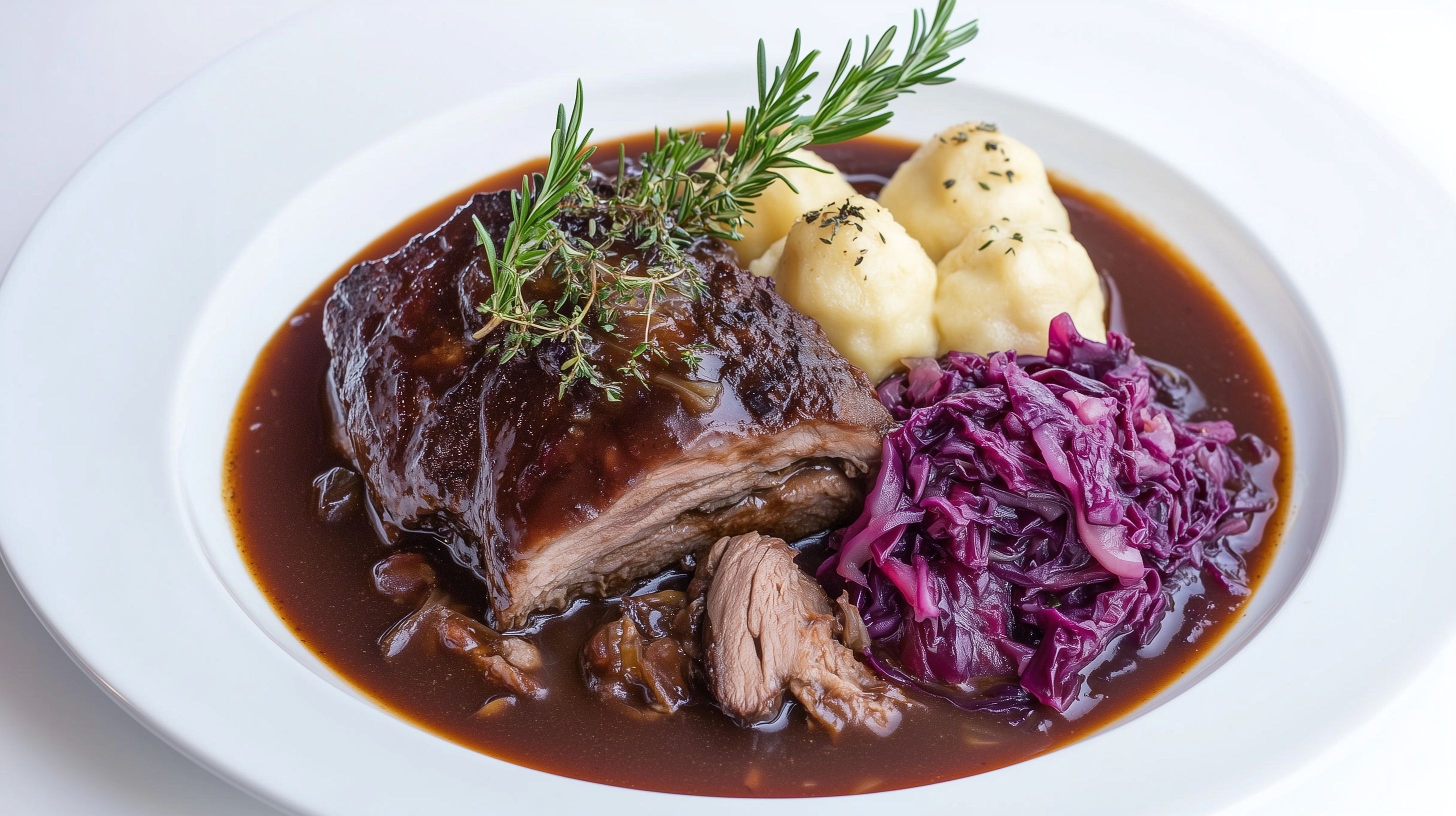 Das Bild zeigt ein traditionelles deutsches Sauerbraten-Gericht, bestehend aus zart gegarem Rinderfleisch in einer kräftigen Rot-Weinsauce, serviert mit luftigen Kartoffelknödeln und würzigem Rotkohl. Die Komposition ist sorgfältig arrangiert, mit frischen Rosmarin-Zweigen als dekorativer Topping. Das Gericht strahlt Gemütlichkeit und Genuss aus und weckt Appetit auf authentische deutsche Küche. Dieses hochwertige Stockfoto eignet sich ideal für den Einsatz in Blogs, Magazinen, Werbematerialien oder Social-Media-Beiträgen rund um das Thema Kulinarik, Restaurants oder traditionelle Gerichte. Das Foto ist in hoher Auflösung und unter einer Creative-Commons-Lizenz verfügbar.