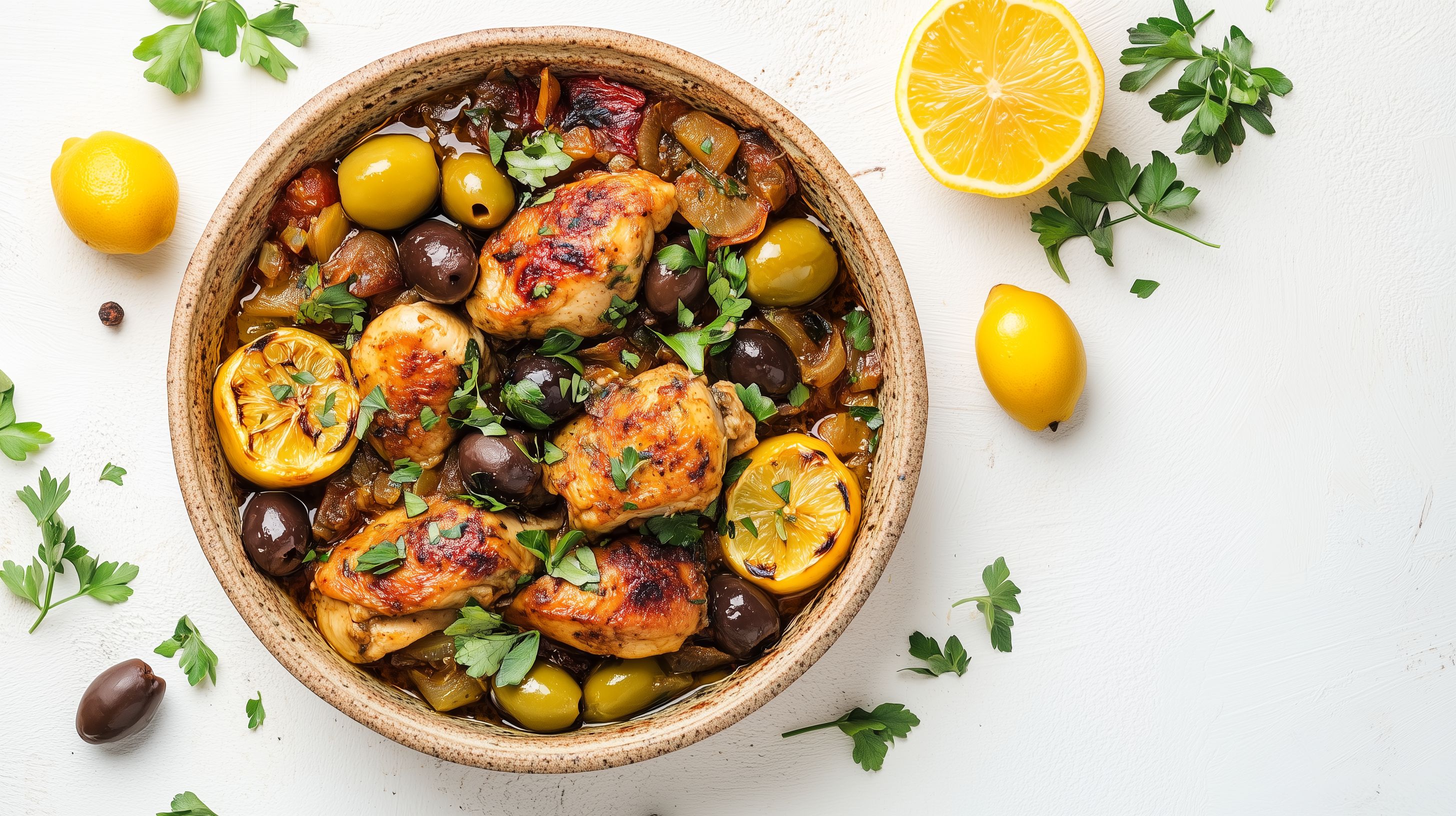 Dieses Foto zeigt eine würzige Hühnchenpfanne mit Oliven und Zitronen, die in einer rustikalen Holzschale angerichtet ist. Die Zutaten sind sorgfältig arrangiert und verleihen dem Gericht eine appetitliche Optik. Die Kombination von zartem Hühnchen, fruchtigen Oliven und frischen Zitronenspitzen sowie der Einsatz von Kräutern und Gewürzen verspricht einen intensiven Geschmack. Dieses kostenpflichtige Stockfoto in hoher Auflösung eignet sich perfekt für Rezeptblogger, Social-Media-Kanäle oder als Eyecatcher in Werbekampagnen für mediterrane Küche und gesunde Ernährung. Es steht unter einer Creative-Commons-Lizenz zur Verwendung frei.