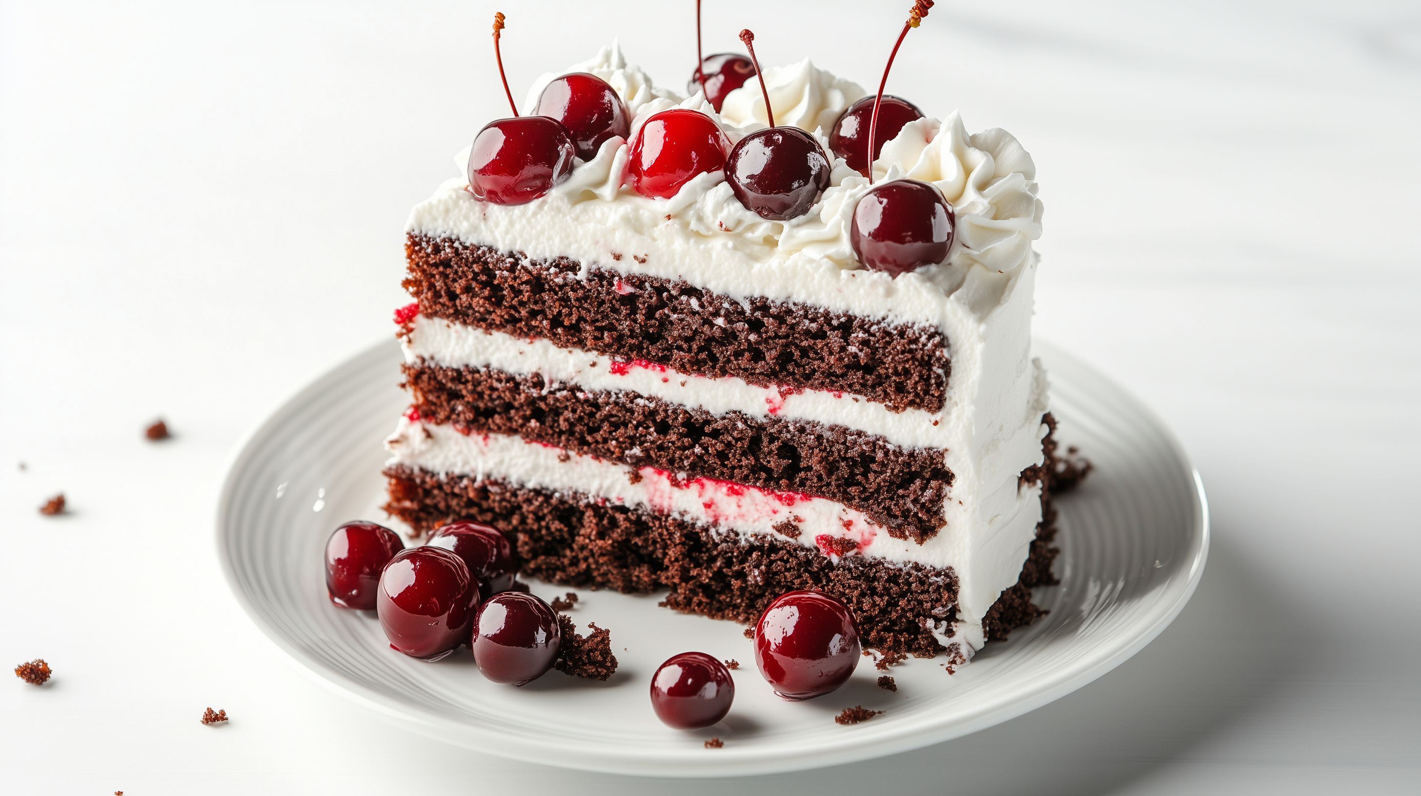 Das Bild zeigt eine leckere und dekorativ angerichtete Schwarzwälder Kirschtorte. Die dreistöckige Torte ist mit einer cremigen Sahnehaube und frischen, glänzenden roten Kirschen auf der Oberseite garniert. Die dunkelbraunen Böden der Torte sind durch Zwischenschichten in einem hellen Creme-Ton abgesetzt. Das Foto ist in einer natürlichen, hellen Umgebung aufgenommen, was der Torte eine appetitliche Ausstrahlung verleiht. Dieses Stockfoto in hoher Auflösung eignet sich ideal für die Verwendung in Rezeptblogs, Kochbüchern, Restaurantwebsites oder Werbematerialien rund um das Thema Backwaren und Desserts. Die Torte ist unter einer Creative-Commons-Lizenz für kommerzielle und private Zwecke kostenlos nutzbar.