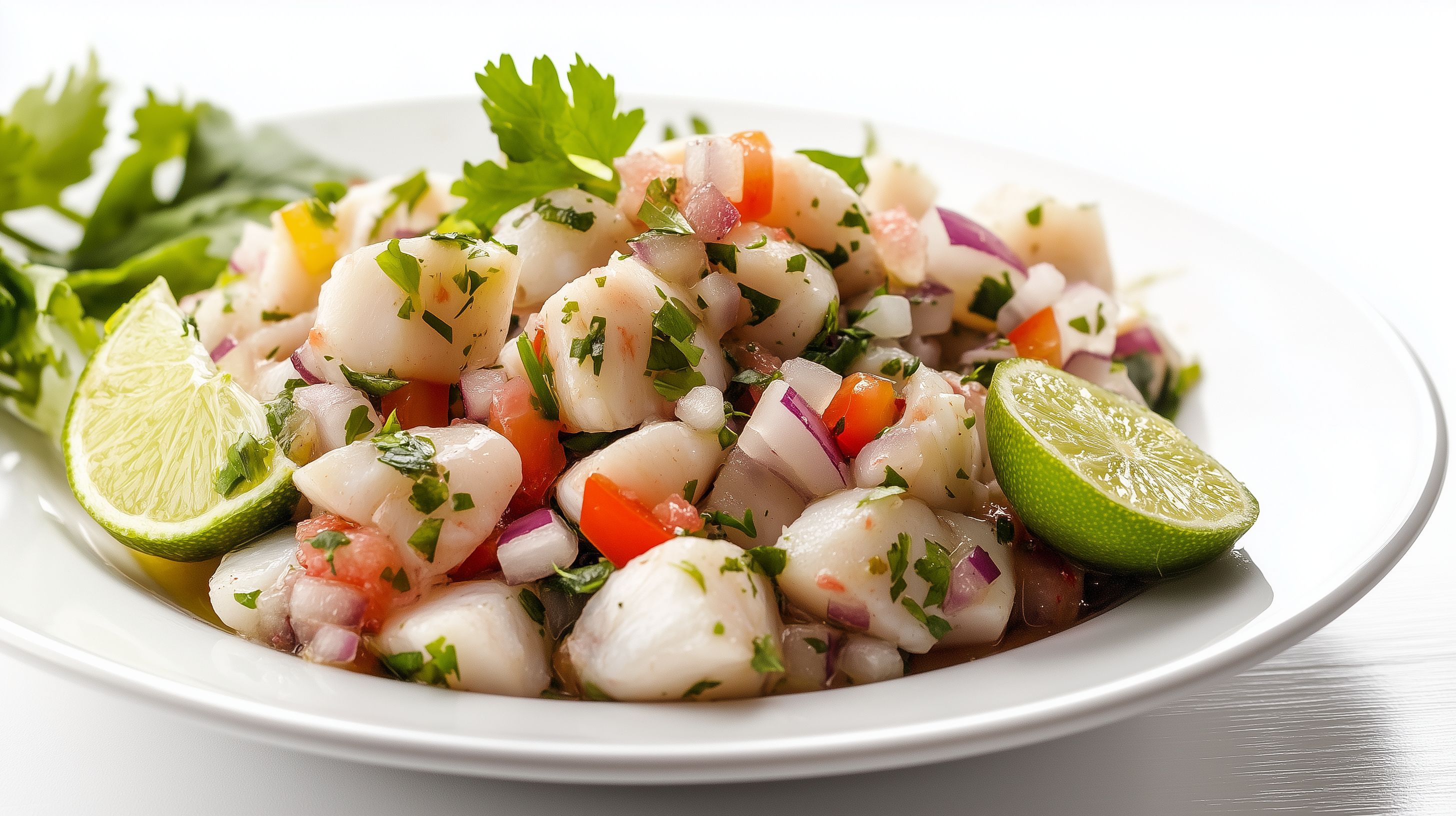 Dieses Foto zeigt einen frisch zubereiteten Ceviche-Salat auf einem weißen Teller. Die Zutaten umfassen Fisch, Limettenscheiben, rote Zwiebeln, Tomaten und Kräuter wie Petersilie. Der Salat ist optisch sehr appetitlich angerichtet und versprüht ein frisches, sommerliches Flair. Das Gericht eignet sich perfekt als leichte Vorspeise oder Appetizer, beispielsweise für ein Blog-Rezept, einen Newsletter oder die Verwendung in Werbematerialien. Dieses hochauflösende Stockfoto steht unter einer Creative-Commons-Lizenz zur kostenlosen Nutzung zur Verfügung.