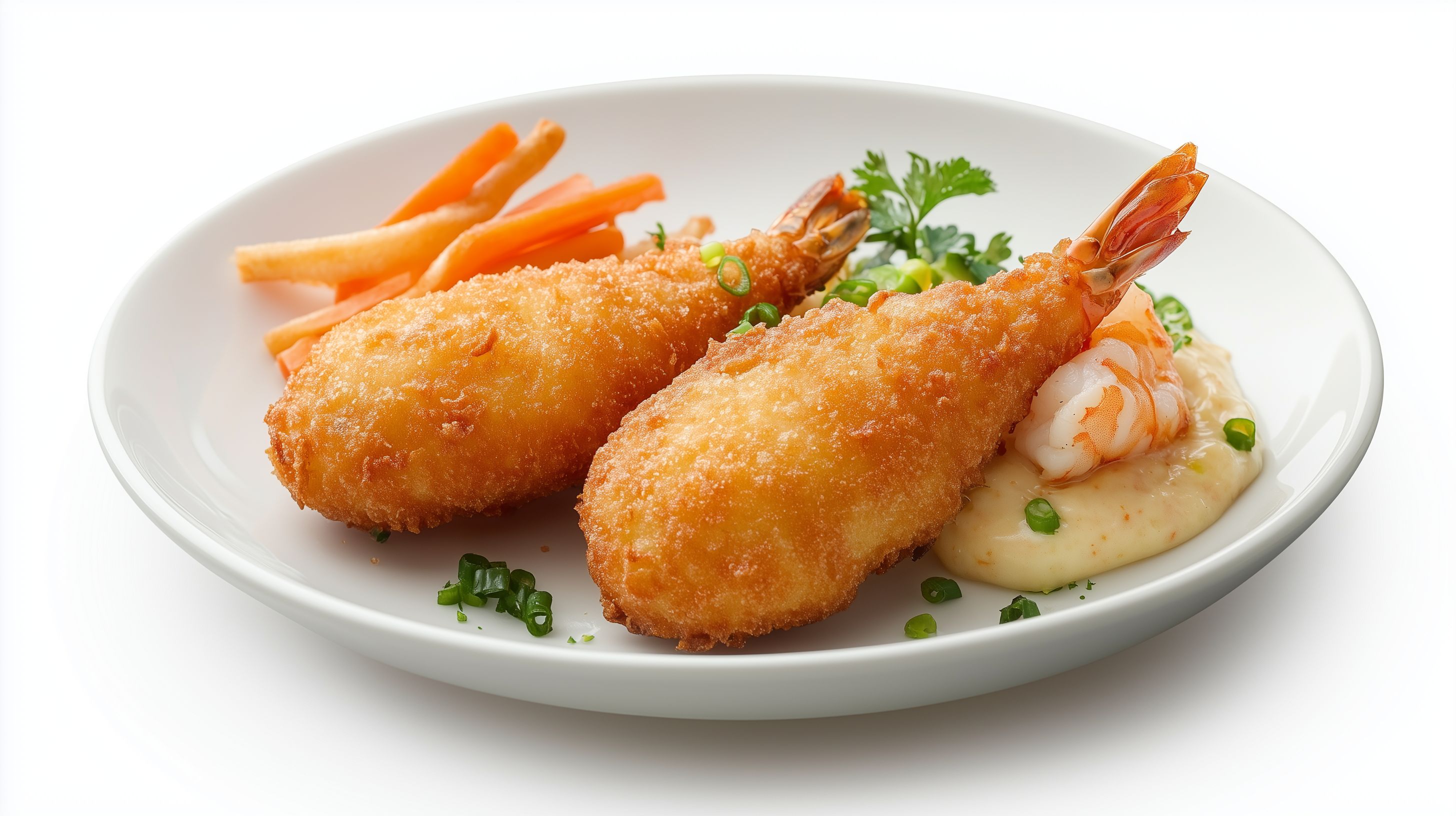 Das Foto zeigt eine appetitlich angerichtete Portion frittierter Garnelen-Häppchen, die auf einem weißen Teller serviert werden. Die knusprig-goldbraunen Garnelenkroketten sind dekorativ mit grünen Petersilienblättchen und Karottensticks garniert. Neben den Garnelen ist eine helle, cremige Sauce zu sehen, die als Beilage fungiert. Insgesamt präsentiert sich das Gericht sehr einladend und lecker, ideal als Vorspeise oder leichtes Hauptgericht. Dieses hochwertige Stockfoto in hoher Auflösung eignet sich hervorragend für die Verwendung in Blogs, Newslettern, Social-Media-Kanälen oder für Werbezwecke unter einer Creative-Commons-Lizenz.