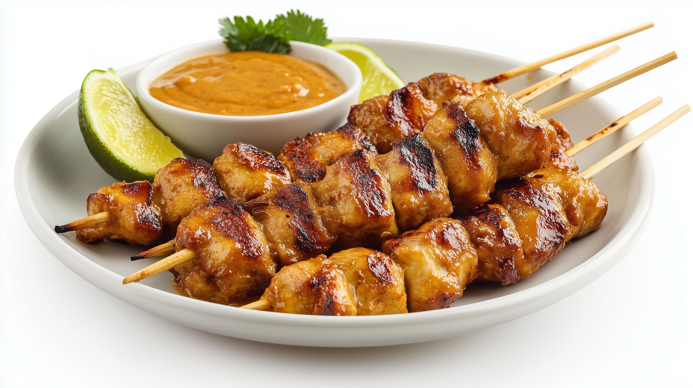 Das Bild zeigt eine Platte mit leckeren, goldbraun gegrillten Fleischspießen, die traditionell als Satay-Gericht serviert werden. Die Fleischstücke sind auf Holzspießen aufgespießt und werden von einer cremigen Erdnusssauce und frischen Limettenscheiben begleitet. Der Teller ist auf einem weißen Untergrund angerichtet, was den Fokus auf die köstlichen Hauptzutaten lenkt. Dieses hochauflösende Foto eignet sich hervorragend als kostenloses Stockfoto für Blogs, Newsletter, Social-Media-Beiträge und Werbeanzeigen in der asiatischen Küche oder im Bereich Grillen und Appetizer.