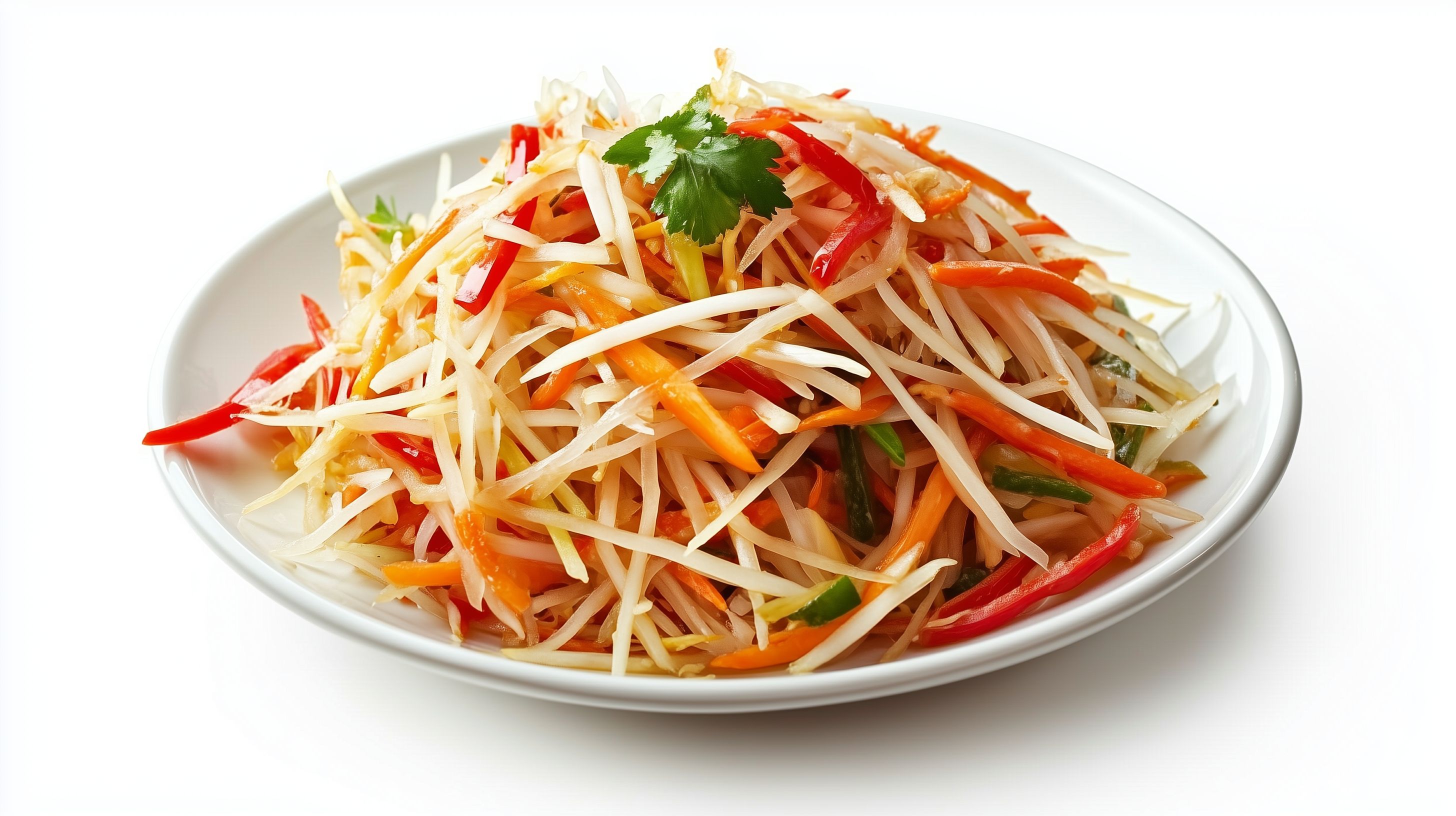 Dieses appetitliche Foto zeigt einen frisch zubereiteten grünen Papaya-Salat in einer modernen, weißen Schüssel. Der Som Tam, wie er in der thailändischen Küche genannt wird, ist eine köstliche und gesunde Speise aus Papayastreifen, Möhren, Chilischoten, Koriander und weiteren knackigen Zutaten. Das Foto eignet sich hervorragend als kostenloses Stockbild für Rezeptblog-Beiträge, Newsletter oder Social-Media-Posts rund um Ernährung, Veggie-Küche oder asiatische Gerichte. In hoher Auflösung und unter der Creative-Commons-Lizenz verfügbar.