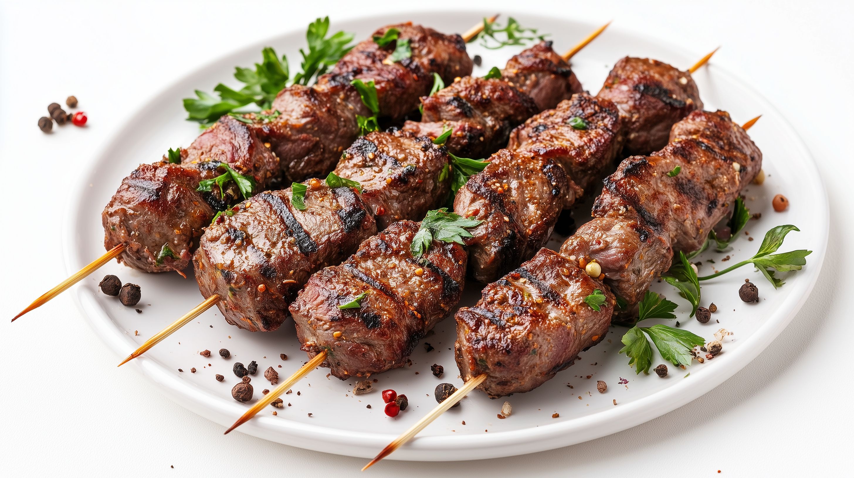 Dieses appetitliche Foto zeigt eine Platte mit saftigen Lammspießen, die mit aromatischen Gewürzen und frischen Kräutern wie Petersilie und Koriander garniert sind. Die Spieße haben eine schöne braune Kruste und stehen auf einem hellen Teller, umgeben von Pfefferkörnern und anderen Gewürzen. Das Foto eignet sich hervorragend für den Einsatz in Kochrezepten, Gastronomie-Werbung oder Lebensmittel-Präsentationen. Als hochwertiges Stockfoto in Creative-Commons-Lizenz kann es kostenlos und in hoher Auflösung verwendet werden.