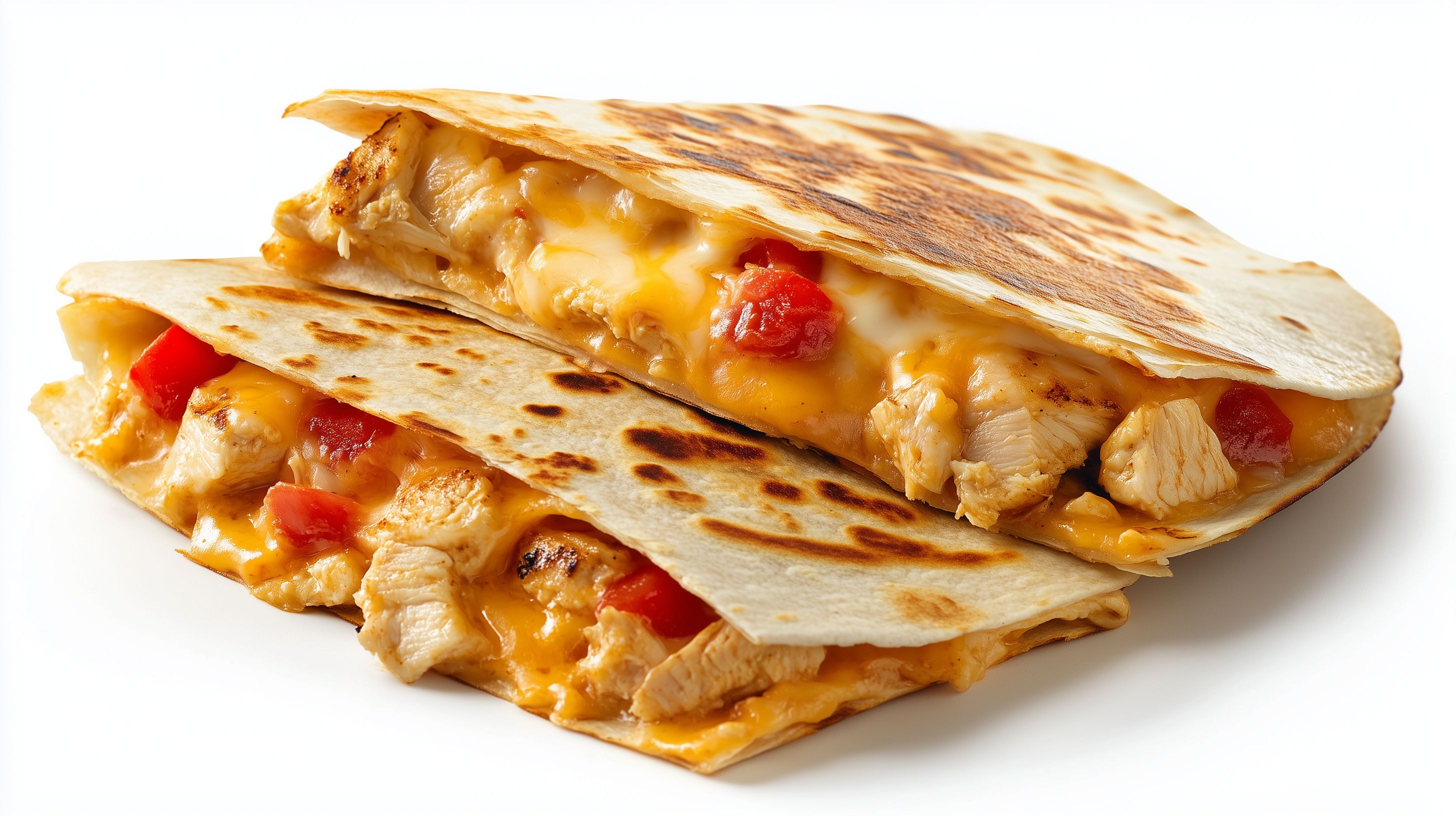Das Bild zeigt eine leckere Hühnchen-Quesadilla, die frisch aus der Pfanne kommt. Die Tortilla ist knusprig gegrillt und mit geschmolzenem Käse, Hühnchenfleisch und roten Paprikastücken gefüllt. Das Gericht sieht sehr appetitlich aus und eignet sich perfekt als Snack, Mittagessen oder Abendessen. Dieses hochwertige Stockfoto in hoher Auflösung kann kostenlos für Blogs, Newsletter, Social-Media-Beiträge oder Werbezwecke unter der Creative-Commons-Lizenz genutzt werden.